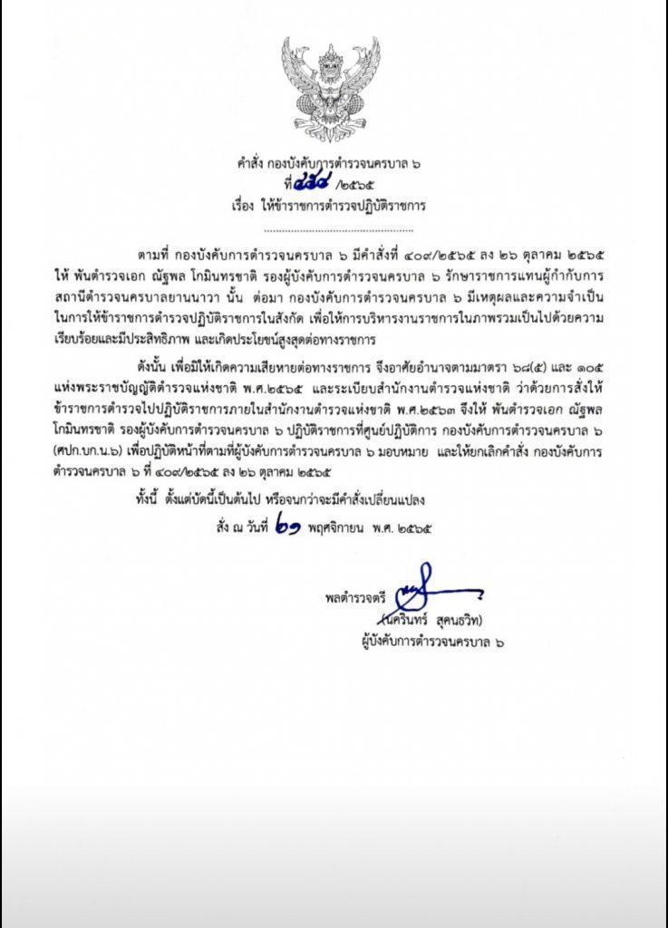 นอกจากนี้ยังลงนามในคำสั่งกองบังคับการตำรวจนครบาล 6 ที่ 454/2565 เรื่องให้ข้าราชการตำรวจปฏิบัติราชการ ใจความว่า ตามที่กองบังคับการตำรวจนครบาล 6 มีคำสั่งที่ 409/2565 ลง 26 ตุลาคม 2565 ให้พ.ต.อ.ณัฐพล โกมินทรชาติ รองผู้บังคับการตำรวจนครบาล 6 รักษาราชการแทนผู้กำกับการ สถานีตำรวจนครบาลยานนาวา นั้น ต่อมา กองบังคับการตำรวจนครบาล 6 มีเหตุผลและความจำเป็นในการให้ข้าราชการตำรวจปฏิบัติราชการในสังกัด เพื่อให้การบริหารงานราชการในภาพรวมเป็นไปด้วยความเรียบร้อยและมีประสิทธิภาพ และเกิดประโยชน์สูงสุดต่อทางราชการ
