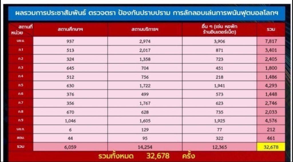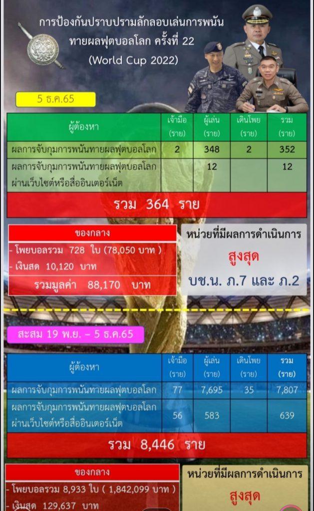 ด้านการปราบปราม เช่น การจัดตั้งศูนย์ป้องกันและปราบปรามการลักลอบเล่นการพนันทายผลฟุตบอล โดยมีผลการจับกุมการลักลอบเล่นการพนันทายผลฟุตบอลโลกครั้งที่ 22 (World Cup 2022) ตั้งแต่ 19 พ.ย.65 – ปัจจุบัน จำนวน 8,446 ราย (ออนไลน์จำนวน 639 ราย) รวมมูลค่าความเสียหายกว่า 1,971,736 บาท