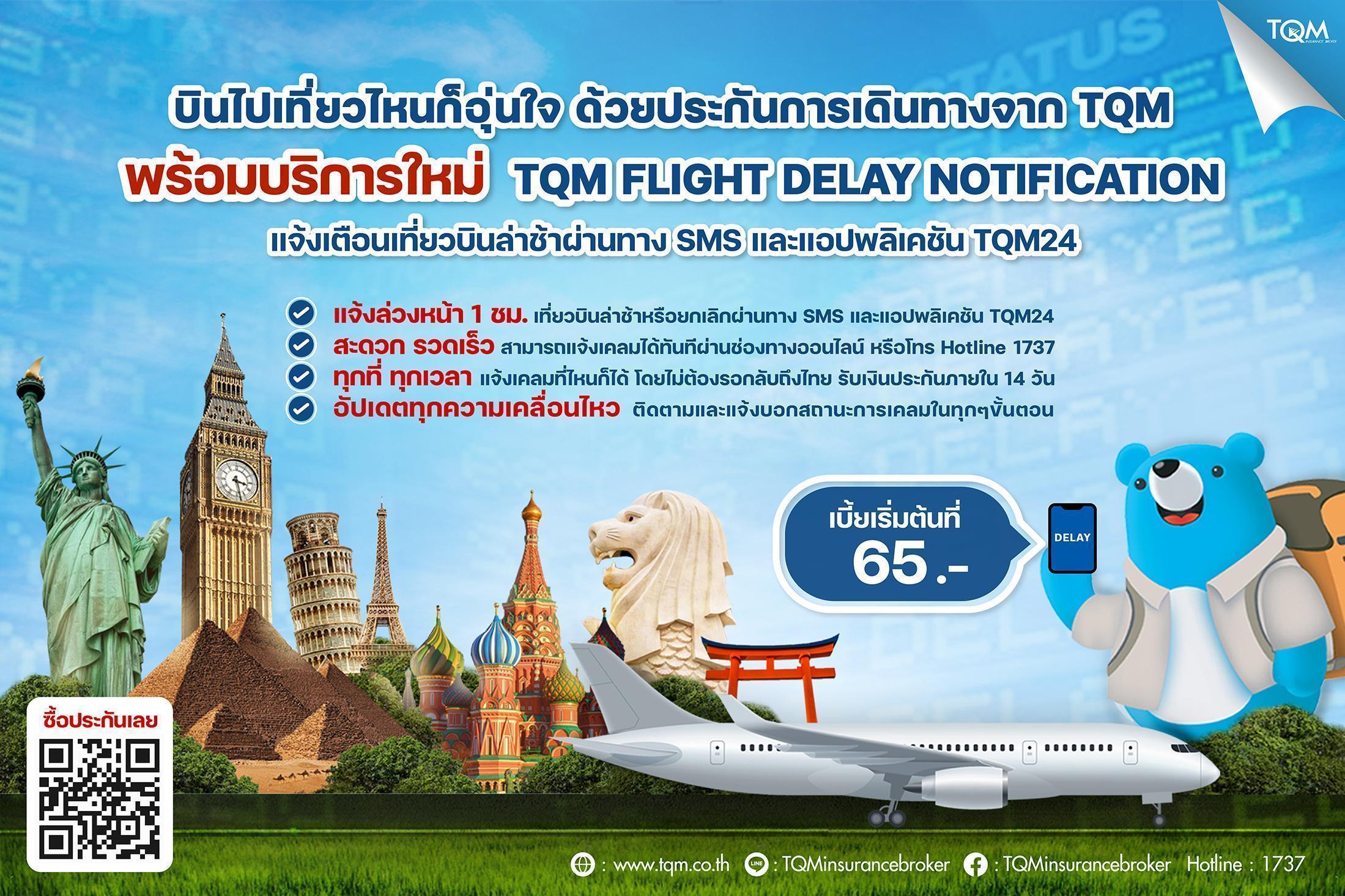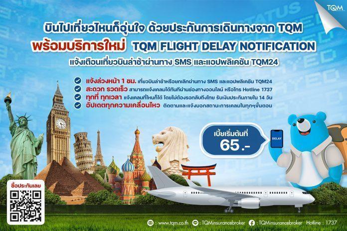 นอกจากปัญหาระหว่างการเดินทางที่เกิดขึ้นแล้ว สิ่งที่นักท่องเที่ยวต้องพบมากจนสร้างประสบการณ์ที่ไม่ดีในการเดินทางในแต่ละทริปคือ ปัญหาเที่ยวบินล่าช้า หรือเที่ยวบินถูกยกเลิก โดยไม่ทราบล่วงหน้า ซึ่ง TQM เข้าใจถึงทุกสภาพปัญหาที่เกิดขึ้น จึงได้พัฒนาบริการ ‘TQM Flight Delay Notification’ หรือบริการแจ้งเตือนไฟล์ทล่าช้า สำหรับลูกค้าที่ซื้อประกันการเดินทางกับ TQM เพื่อที่จะแจ้งเตือนลูกค้าล่วงหน้า หากเกิดกรณีเที่ยวบินล่าช้าหรือยกเลิก และเพิ่มความสะดวกสบายให้กับลูกค้ามากขึ้นด้วยการแจ้งเคลมประกันการเดินทางผ่านทางแอปพลิเคชัน TQM24 ได้เลยในทันที โดยไม่ต้องรอเดินทางกลับมาถึงประเทศไทย ซึ่งแอปพลิเคชัน TQM24 จะมีการแจ้งอัพเดทสถานะการแจ้งเคลมให้ลูกค้าได้ทราบทุกขั้นตอนจนถึงการรับเงินค่าสินไหมทดแทนในระยะเวลาไม่เกิน 14 วัน