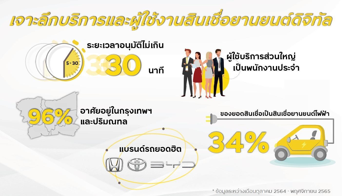 • ง่ายกว่า เพียงปลายนิ้วสัมผัส: สะดวกสบายด้วยบริการทุกขั้นตอนบนแพลตฟอร์มดิจิทัล ตั้งแต่การสมัครสินเชื่อ ตรวจสอบข้อมูล ยืนยันตัวตนในรูปแบบดิจิทัล (NDID) และรับแจ้งผลพร้อมวงเงินอนุมัติ โดยไม่ต้องยื่นเอกสารเพิ่มเติม เพียงแค่ใช้บัตรประชาชนในการทำสัญญาและออกรถเท่านั้น