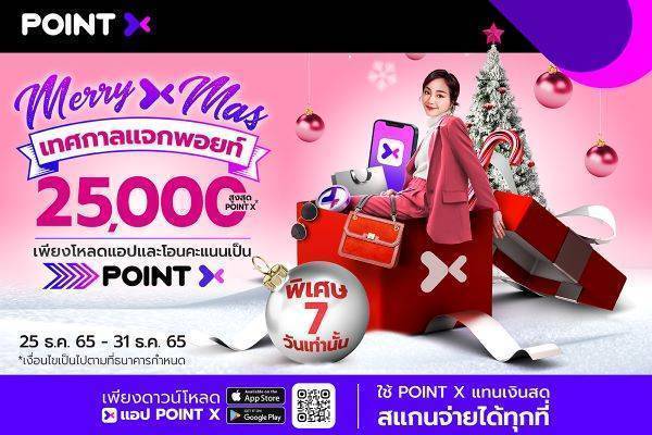 “PointX” (พอยท์เอกซ์) แพลตฟอร์มที่รวมทุกคะแนนสะสมไว้ในที่เดียว เปลี่ยนประสบการณ์การใช้และสะสมพอยท์แบบไร้ขีดจำกัด ให้สามารถใช้พอยท์ได้เหมือนเงินสด พัฒนาโดย “เอสซีบี เทคเอกซ์” (SCB TechX) บริษัทผู้เชี่ยวชาญด้านดิจิทัลเทคโนโลยี ภายใต้กลุ่มเอสซีบี เอกซ์ (SCBX Group) เดินหน้ายกระดับประสบการณ์ช้อปปิ้งแบบเหนือระดับ พร้อมปลดล็อกสู่โลกใหม่แห่งการใช้และสะสมพอยท์ ส่งแคมเปญ “Merry X Mas เทศกาลแจกพอยท์สุดพิเศษ 7 วันเท่านั้น” สำหรับผู้ถือบัตรเครดิตไทยพาณิชย์ และ บัตรเครดิตคาร์ดเอกซ์ ทุกประเภท ยกเว้นบัตร CardX Family Plus และบัตร SCB M ให้สามารถเริ่มต้นอิสระแห่งการใช้พอยท์จ่ายแทนเงินสดได้ทุกที่ สำหรับลูกค้าใหม่เพียงดาวน์โหลดแอปพลิเคชัน PointX และทำการโอนคะแนนจากบัตรเครดิตมาเป็นคะแนน PointX ตามที่กำหนด ในช่วงเทศกาลแจกพอยท์ 7 วันสุดปัง รับเพิ่มสูงสุด 25,000 PointX ตั้งแต่วันที่ 25 ธันวาคม 2565 – 31 ธันวาคม 2565 นี้เท่านั้น