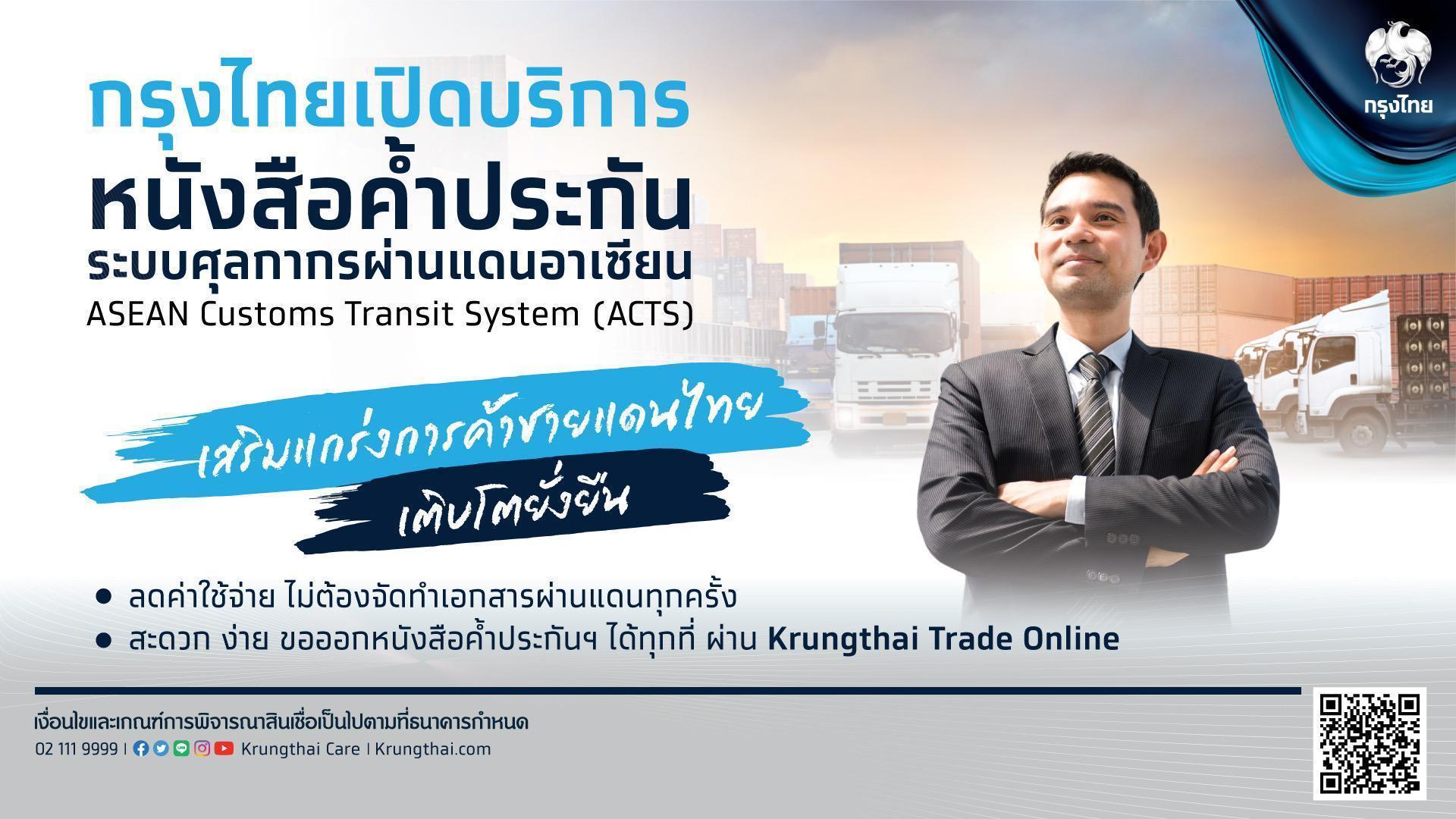 ล่าสุด ธนาคารได้นำร่องเปิดให้บริการหนังสือค้ำประกันระบบศุลกากรผ่านแดนอาเซียน หรือ Bank Guarantee for ASEAN Customs Transit System (ACTS) เป็นธนาคารแรก เพื่อยกระดับการค้าระหว่างประเทศและเพิ่มประสิทธิภาพบริการศุลกากรสำหรับการขนส่งสินค้าผ่านแดนระหว่างประเทศในภูมิภาคอาเซียน ประกอบด้วย ไทย มาเลเซีย พม่า ลาว เวียดนาม สิงคโปร์ และกัมพูชา โดยผู้ประกอบการสามารถวางหนังสือค้ำประกันฉบับเดียวเพื่อเป็นหลักประกันในการขนส่งสินค้าผ่านแดนไปยังทุกประเทศในภูมิภาคอาเซียน ที่ใช้ระบบศุลกากรผ่านแดนอาเซียน ลดความซ้ำซ้อนและค่าใช้จ่าย โดยไม่ต้องจัดทำเอกสารผ่านแดนทุกครั้ง เมื่อขนส่งสินค้าผ่านไปยังประเทศต่างๆ และยังสามารถเลือกได้ว่าจะวางค้ำประกันเป็นแบบต่อเที่ยว (Single journey) หรือวางค้ำประกันเป็นแบบหลายเที่ยวต่อการวางค้ำประกันหนึ่งครั้ง (Multiple journey) อีกทั้งยังสามารถใช้ยานพาหนะเดียววิ่งรับขนส่งสินค้าตลอดการผ่านแดน โดยที่ไม่ต้องเปลี่ยนถ่ายยานพาหนะ ทำให้กระบวนการขนส่งมีความรวดเร็วขึ้น และสามารถส่งคำขอออกหนังสือค้ำประกันผ่านแดนได้ทุกที่ ผ่านระบบ Krungthai Trade Online ทำให้บริหารจัดการการขนส่งสินค้าและเวลาในการทำธุรกรรมได้คล่องตัวมากยิ่งขึ้น