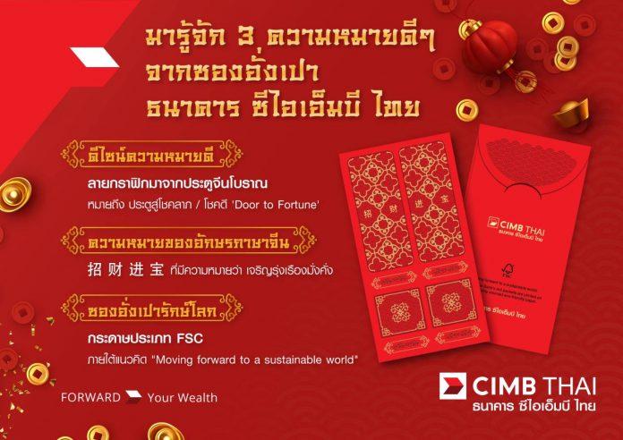 สำหรับซองอั่งเปาของธนาคาร ซีไอเอ็มบี ไทย ในปี 2566 มีแนวคิดการออกแบบคือ ‘Door to Fortune’ หรือ ประตูสู่โชคลาภ โชคดี ซึ่งประตูไม่ได้เป็นเพียงแค่ทางเดินผ่าน แต่เป็นเสมือนสัญลักษณ์ของความเป็นครอบครัว และเป็นธรรมเนียมปฏิบัติที่จะเปิดประตูตอนเที่ยงคืนวันส่งท้ายปีเก่า เพื่อปล่อยสิ่งไม่ดีให้ออกไป และพร้อมรับความโชคดีที่มากับปีใหม่ ซึ่งบนซองอั่งเปาจะมีคำอวยพรภาษาจีนอยู่บนลายกราฟฟิกประตู ที่มีความหมายว่า เจริญรุ่งเรืองมั่งคั่ง นอกจากนี้ ซองอังเปาของธนาคาร ยังเป็นมิตรต่อสิ่งแวดล้อม” โดยธนาคารใช้วัสดุที่เป็นมิตรกับสิ่งแวดล้อม คือ กระดาษประเภท FSC (Forest Stewardship Council) ภายใต้แนวคิด “Moving forward to a sustainable world”