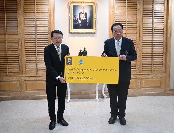 กรุงศรี (ธนาคารกรุงศรีอยุธยา จำกัด (มหาชน)) โดย นายพูนสิทธิ์ ว่องธวัชชัย (ซ้าย) ผู้ช่วยกรรมการผู้จัดการใหญ่ ผู้บริหารสายงานการพัฒนาด้านสิ่งแวดล้อม สังคม และธรรมาภิบาลสู่ความยั่งยืน ธนาคารกรุงศรีอยุธยา จำกัด (มหาชน) มอบเงินจำนวน 500,000 บาท เพื่อสนับสนุนมูลนิธิถันยรักษ์ ในพระราชูปถัมภ์สมเด็จพระศรีนครินทราบรมราชชนนี ในการตรวจแมมโมแกรมคัดกรองมะเร็งเต้านมแก่สตรีด้อยโอกาส ต่อเนื่องเป็นปีที่ 13 โดยมี ศาสตราจารย์คลินิก นายแพทย์วิศิษฎ์ วามวาณิชย์ (ขวา) ประธานศูนย์ถันยรักษ์ เป็นผู้รับมอบ ณ ศูนย์ถันยรักษ์ โรงพยาบาลศิริราช