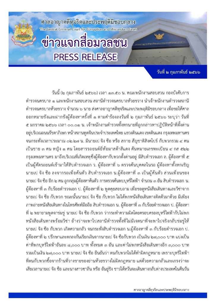 เมื่อวันที่ 2 ก.พ.2666 ที่ศาลอาญาคดีทุจริตและประพฤติมิชอบกลาง คณะพนักงานสอบสวน กองบังคับการ ตำรวจนครบาล 1 และ พนักงานสอบสวน สถานีตำรวจนครบาลห้วยขวาง นำเจ้าพนักงานตำรวจสถานตำรวจนครบาลห้วยขวาง จำนวน 6 นาย ส่งศาลอาญาคดีทุจริตและประพฤติมิชอบกลาง เพื่อขอให้ศาลออกหมายขังและฝากขัง ผู้ต้องหา ครั้งที่ 1 ตามคำร้องลงวันที่ 2 กุมภาพันธ์ 2566 ระบุว่า วันที่ 5 มกราคม 2566 เวลา 00.01 น. เจ้าพนักงานตำรวจทั้งหกนายที่ถูกกล่าวหาปฏิบัติหน้าที่ตั้งด่านอยู่บริเวณถนนรัชดาภิเษก หน้าสถานทูตจีนประจำประเทศไทย แขวงดินแดง เขตดินแดง กรุงเทพมหานคร
