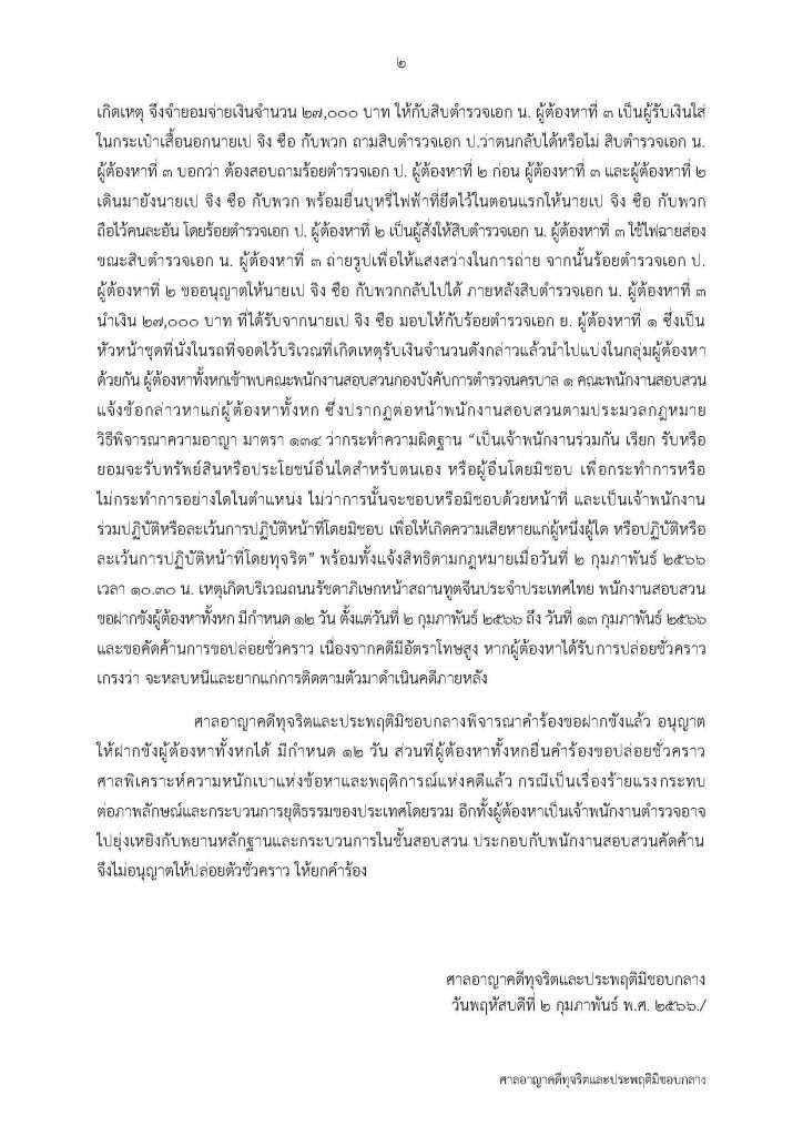 ศาลพิเคราะห์ความหนักเบาแห่งข้อหาและพฤติการณ์แห่งคดีแล้ว กรณีเป็นเรื่องร้ายแรง กระทบต่อภาพลักษณ์และกระบวนการยุติธรรมของประเทศโดยรวม อีกทั้งผู้ต้องหาเป็นเจ้าพนักงานตำรวจอาจไปยุ่งเหยิงกับพยานหลักฐานและกระบวนการในชั้นสอบสวน ประกอบกับพนักงานสอบสวนคัดค้านจึงไม่อนุญาตให้ปล่อยตัวชั่วคราว ให้ยกคำร้องศาลอาญาคดีทุจริตและประพฤติมิชอบกลางวันพฤหัสบดีที่ 2 กุมภาพันธ์ พ.ศ. 2566 คำสั่งศาลอาญาคดีทุจริตและประพฤติมิชอบกลาง ระบุ”
