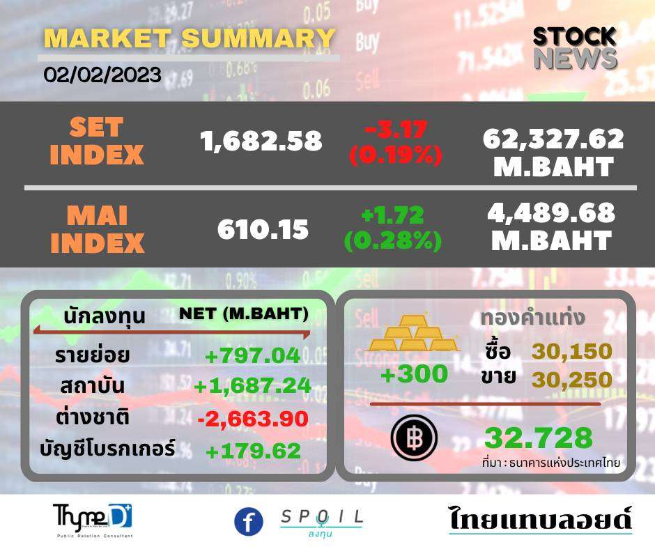 SET ปิดวันนี้ที่ 1,682.58 จุด ลดลง 3.17 จุด (-0.19%) มูลค่าการซื้อขาย 62,327.62 ล้านบาท