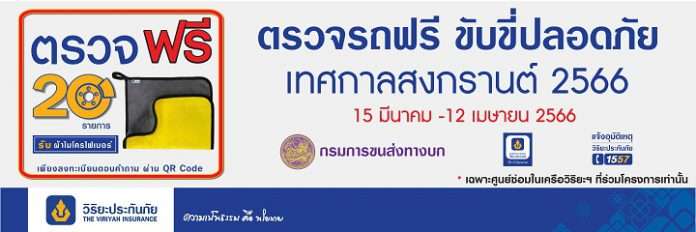 วิริยะประกันภัย ร่วมกับ กรมการขนส่งทางบก บูรณาการความปลอดภัยในการใช้รถใช้ถนน จัดกิจกรรม “ตรวจรถฟรี ขับขี่ปลอดภัย” มุ่งหวังลดอุบัติเหตุช่วงเทศกาลสงกรานต์ ปี 2566 และให้ประชาชนตระหนักถึงความสำคัญในการเตรียมความพร้อมของสภาพรถยนต์ก่อนออกเดินทาง พร้อมให้บริการตรวจสภาพรถยนต์เบื้องต้นฟรี 20 รายการ ณ ศูนย์ซ่อมมาตรฐานวิริยะประกันภัย 31 แห่ง ในพื้นที่กรุงเทพฯ และปริมณฑล ระหว่างวันที่ 15 มี.ค.- 12 เม.ย.66