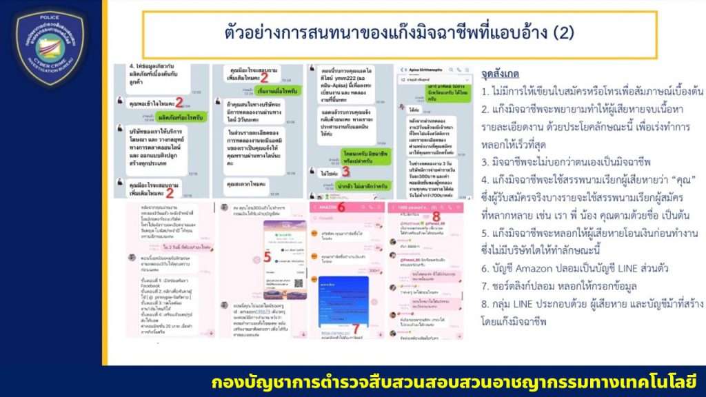 พ.ต.อ.กฤษณะ พัฒนเจริญ โฆษก กองบัญชาการตำรวจสืบสวนสอบสวนอาชญากรรมทางเทคโนโลยี (บช.สอท.) ขอฝากเตือนภัยมิจฉาชีพโทรศัพท์ไปยังผู้เสียหาย แอบอ้างเป็นบริษัทที่เคยสมัครงาน หลอกลวงเหยื่อให้ทดลองงาน โดยการทำภารกิจออนไลน์ต่างๆ ดังนี้ที่ผ่านมา บช.สอท. ได้รับแจ้งความร้องทุกข์จากผู้เสียหายหลายรายว่า ได้รับโทรศัพท์จากมิจฉาชีพซึ่งแอบอ้างเป็นพนักงานบริษัทที่ตนได้เคยกรอกข้อมูลหรือฝากประวัติส่วนตัว หมายเลขโทรศัพท์ติดต่อ และตำแหน่งที่สนใจไว้ผ่านเว็บไซต์หางานต่างๆ โดยมิจฉาชีพได้นำข้อมูลดังกล่าวมาสอบถามผู้เสียหายว่าสนใจสมัครงานในตำแหน่งนี้ใช่หรือไม่ หากใช่จะให้เพิ่มเพื่อนทางไลน์ของพนักงานบริษัท เพื่อทำการพูดคุยแจ้งลักษณะของงานให้ทราบ และจะต้องทดลองงานก่อนเป็นเวลา 3 วัน หากผ่านการทดลองงานแล้วจะมีเจ้าหน้าที่ติดต่อไปแจ้งสวัสดิการต่างๆ เช่น วัดหยุด โบนัสประจำปี เป็นต้น แต่ในช่วงทดลองงานมิจฉาชีพจะให้ผู้เสียหายโอนเงินส่วนหนึ่งเป็นค่าใช้จ่ายรายวันก่อนที่จะให้ทำภารกิจต่างๆ เริ่มจากการให้เข้าไปกดถูกใจ หรือกดไลก์บุคคลที่มีชื่อเสียง บันทึกภาพหน้าจอสถานที่ท่องเที่ยวต่างๆ ในขั้นตอนสุดท้ายมิจฉาชีพจะส่งลิงก์ให้ติดตั้งแอปพลิเคชันปลอมเพื่อไว้ทำภารกิจ กดรับออเดอร์สินค้าในราคาตั้งแต่หลักร้อยไปถึงหลักหมื่นบาท หรืออาจจะมากกว่านั้น ทั้งนี้ในช่วงแรกๆ ผู้เสียหายจะได้เงินคืนมาจริง แต่หลังจากนั้นมิจฉาชีพก็จะออกอุบายต่างๆ เพื่อให้ทำภารกิจพิเศษ หลอกให้เหยื่อเติมเงิน หรือโอนเงินเพิ่มมากขึ้น ทั้งนี้เหยื่อมักเสียดายเงินที่เคยโอนไปก่อนหน้านี้อยากได้เงินทั้งหมดคืน ก็หลงเชื่อโอนเงินไปเพิ่มอีกหลายครั้ง มิจฉาชีพก็จะมีข้ออ้างต่างๆ เช่น อ้างว่าทำผิดขั้นตอน หรือยอดเงินในระบบไม่เพียงพอ อ้างว่าเป็นค่าเอกสาร ค่าปิดบัญชี ค่าภาษี เป็นต้น นอกจากนี้ยังสร้างความน่าเชื่อถือโดยให้หน้าม้าในกลุ่มไลน์แสดงหลักฐานปลอมว่าตนได้รับเงินจริง กระทั่งเมื่อเหยื่อรู้ตัวว่าถูกหลอกลวงก็จะปิดการติดต่อหลบหนีไป