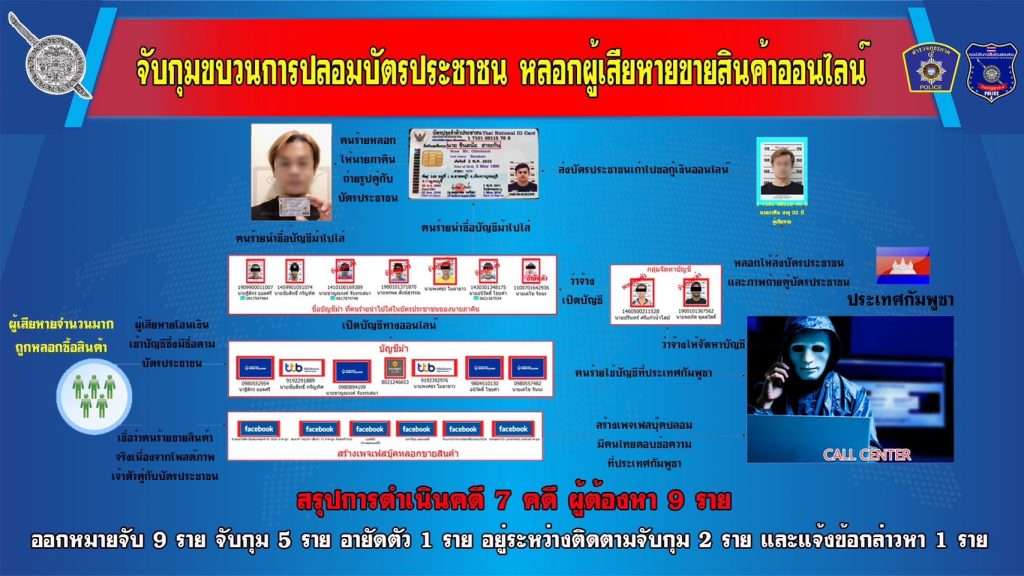 จากการสืบสวนสอบสวนพบว่า มีผู้เสียหาย ได้ถูกหลอกลวงให้ซื้อสินค้าผ่านระบบออนไลน์ แต่ไม่ได้สินค้า โดยคนร้ายได้ใช้บัญชีธนาคารของบุคคลดังกล่าวข้างต้น คือ นายชัยสิทธิ์ กรัญทิศ,นายชาญณรงค์ จันทรเสนา,นายพรพล สังข์สุวรรณ,นายพงศธร โมลาขาว โดยมีพฤติการณ์คือ ใช้ภาพถ่ายบัตรประชาชนของนายภาคินฯ ไปทำการเปลี่ยนแปลง ชื่อ นามสกุล และหรือ ประจำตัวประชาชน 13 หลัก โดยใช้โปรแกรมคอมพิวเตอร์ในการแก้ไขข้อมูลในภาพ ซึ่งไม่ได้มีการทำบัตรขึ้นมาใหม่ เพียงแต่แก้ไขชื่อ นามสกุล ภายในบัตรเพื่อให้ตรงกับ ชื่อเจ้าของบัญชีธนาคารที่ใช้รับโอนค่าสินค้า ก่อนจะนำไปหลอกขายสินค้าให้กับ ผู้เสียหายและประชาชนทั่วไป เมื่อผู้เสียหายพบว่า ชื่อในภาพบัตรประชาชน ตรงกับชื่อที่คนร้ายได้ส่งมาประกอบการซื้อขายสินค้า และตรงกับชื่อในบัญชีธนาคารที่โอนเงินค่าสินค้า ก็หลงเชื่อว่าเป็นเพจ ที่มีการจำหน่ายสินค้าจริง มีตัวตนจริงตามบัตรประชาชน จึงโอนเงินค่าสินค้าไปต่อมา ผู้เสียหายที่ถูกหลอกขายสินค้าออนไลน์ในพื้นที่ จังหวัดขอนแก่น ร้อยเอ็ด ชัยภูมิ และ เลย จึงได้ร้องทุกข์ดำเนินคดีต่อพนักงานสอบสวน จำนวน 4 คดี