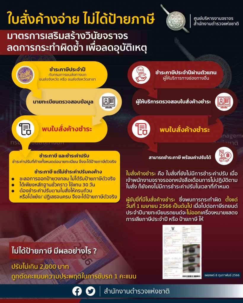 โฆษก ตร. กล่าวว่า “ ขอย้ำเตือนผู้ขับขี่ที่มีใบสั่งค้างชำระ ตั้งแต่วันที่ 1 เมษายน 2566 เป็นต้นไป เมื่อไปต่อภาษีรถยนต์ประจำปี นายทะเบียนรถยนต์จะไม่ออกเครื่องหมายแสดงการเสียภาษีประจำปี หรือ ป้ายภาษี ให้ ผู้ขับขี่ที่ค้างชำระค่าปรับจะได้ใบแทนเสียภาษีชั่วคราว แทนใบจริง จนกว่าจะชำระค่าปรับให้ครบถ้วน ภายใน 30 วัน หลังรับใบแทน