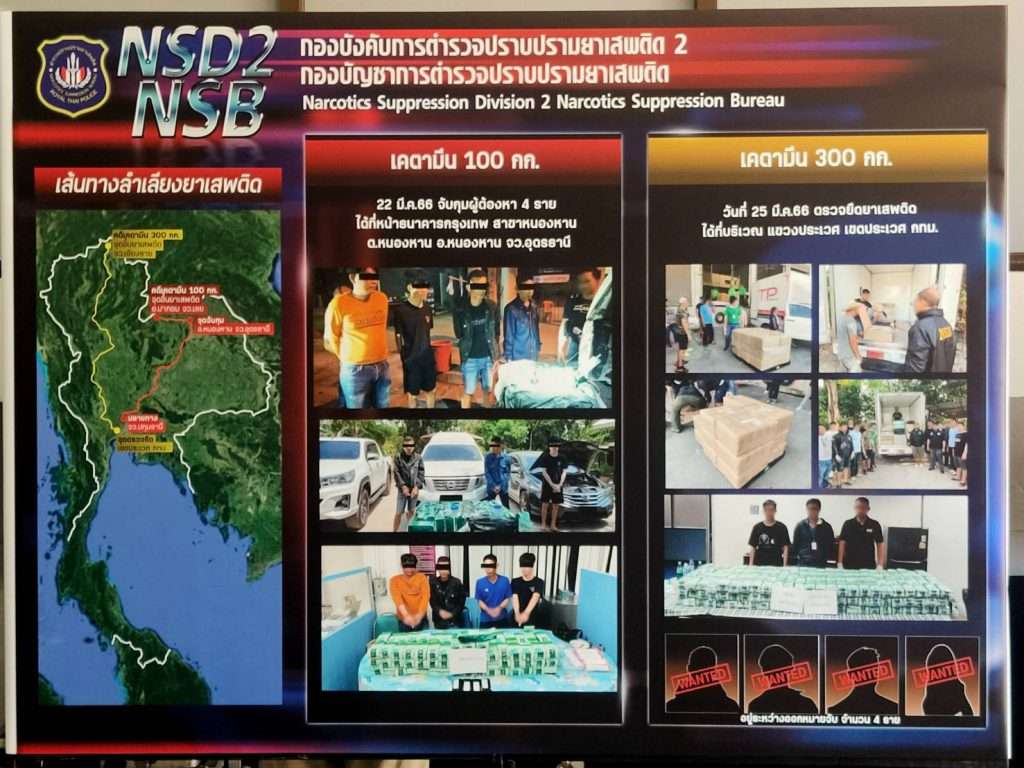 เครือข่ายที่ 2 เจ้าหน้าที่ตำรวจ กก.3 บก.ปส.2 ตรวจสอบพบว่านายวัฒนา(สงวนนามสกุล) มีพฤติการณ์นำยาเสพติดจากพื้นที่ จ.เลย ไปส่งให้กับผู้ค้ายาเสพติดในพื้นที่ภาคกลาง ต่อมาวันที่ 23 มี.ค.66 ตำรวจ ปส.2 ได้ติดตามรถกระบะยี่ห้อนิสสัน สีขาว ซึ่งสืบสวนทราบว่าเป็นรถที่ใช้ขนยาเสพติด ไปถึง อ.หนองหาน จ.อุดรธานี ก่อนพบเข้าไปจอดอยู่บริเวณหน้าธนาคารกรุงเทพ จำกัด สาขาหนองหาน ตำรวจ ปส.2 จึงได้แสดงตัวตรวจค้นรถยนต์พบยาเสพติด คีตามีน วางอยู่บริเวณตอนท้ายกระบะบรรจุอยู่ในถุงชาจีนสีเขียวซุกซ่อนอยู่ในกระสอบพลาสติกสีรุ้ง 4 กระสอบ รวม 100 กก. และตำรวจ ปส.2 อีกชุดได้ติดตามรถยนต์กระบะยี่ห้อโตโยต้ารีโว่ สีขาว และรถยนตยี่ห้อฮอนด้า ซิตี้สีเทา ซึ่งเป็นรถสำรวจเส้นทาง และจับกุม นายวัฒนา (สงวนนามสกุล) อายุ 40 ปี, นายสุภชีพ (สงวนนามสกุล) อายุ 45 ปี,นายวีรธรรม(สงวนนามสกุล) อายุ 36 ปี และนายทิวทอง(สงวนนามสกุล) อายุ 24 ปี ได้ที่ปั๊มน้ำมัน ปตท. หรือบริษัท หนองทานออยส์ จึงแจ้งข้อหา “จำหน่ายวัตถุออกฤทธิ์ในประเภท 2 (คีตามีน) โดยการมีไว้เพื่อจำหน่ายโดยไม่ได้รับอนุญาต อันเป็นการกระทำเพื่อการค้า และการก่อให้เกิดการแพร่กระจายในกลุ่มประชาชน”