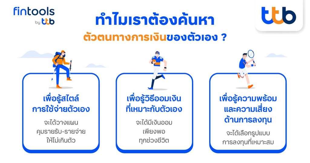หากใครที่ยังไม่รู้จักตัวตนทางการเงินของตัวเอง ทีเอ็มบีธนชาต หรือ ทีทีบี ขอแนะนำตัวช่วย หรือเครื่องมือค้นหาตัวตนทางการเงิน “fintools ตอนนักกีฬาการเงิน” ที่จะชวนมาค้นหาตัวตนทางการเงิน ด้วยการทำแบบทดสอบผ่านเว็บไซต์ทีทีบี คลิก [https://www.ttbbank.com/fintools/16characters]