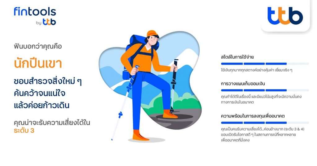 เมื่อลองเล่น “fintools นักกีฬาการเงิน” แล้ว ได้ผลลัพธ์เป็นนักปีนเขา “ชอบสำรวจสิ่งใหม่ ๆ ค้นคว้าจนแน่ใจ แล้วค่อยก้าวเดิน น่าจะได้รับความเสี่ยงได้ในระดับ 3”