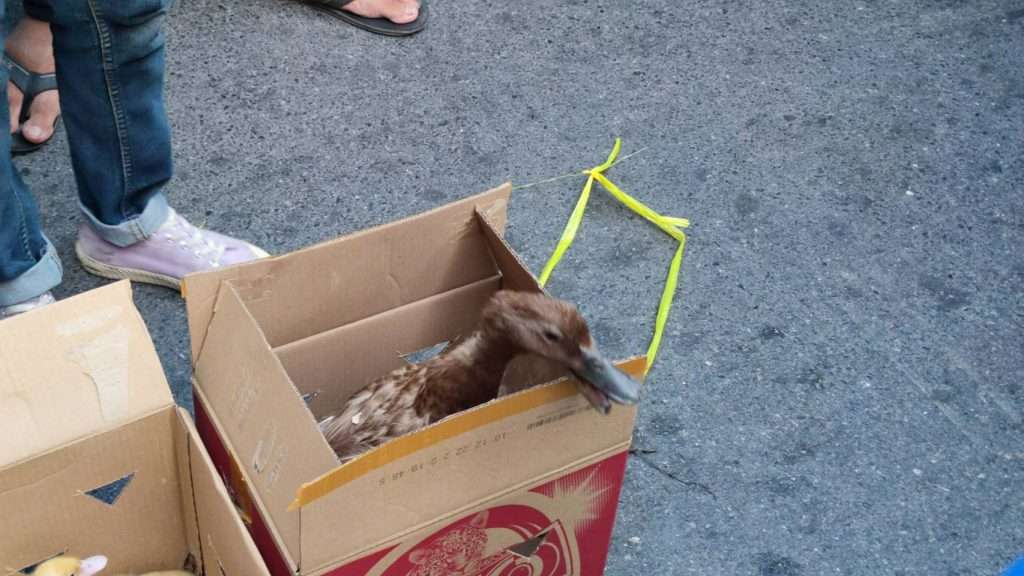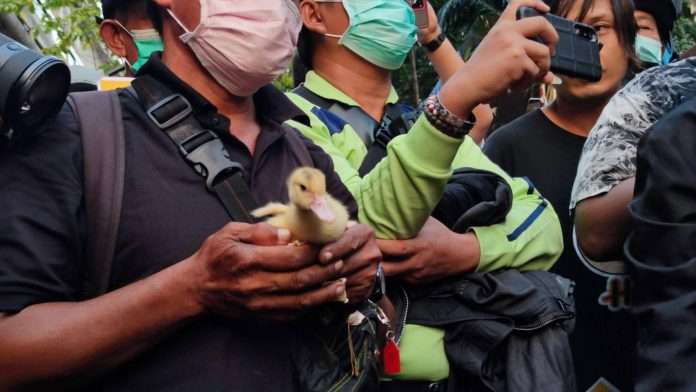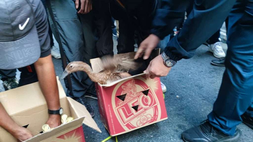 ผู้สื่อข่าวรายงานว่าก่อนเริ่มทำกิจกรรม เจ้าหน้าที่กรมปศุสัตว์ได้เข้าเจรจากับกลุ่มมวลชนที่มาทำกิจกรรมในวันนี้ เพื่อขอไม่ให้ นำเป็ดจริงมาใช้ทำกิจกรรม เพราะจะเข้าข่ายกระทำความผิด ในกรณีเคลื่อนย้ายสัตว์ปีกเข้ากรุงเทพมหานคร ตามพระราชบัญญัติโรคระบาดสัตว์ พ.ศ. 2558 จากนั้นกลุ่มผู้ชุมนุมได้นำกล่องที่มีการบรรจุลูกเป็ดประมาณ 10 ตัว และ เป็ดตัวใหญ่1 ตัว มาบริเวณหน้าสำนักงานตำรวจแห่งชาติเพื่อเริ่มกิจกรรม ก่อนที่เจ้าหน้าที่ตำรวจ และ กรมปศุสัตว์จะชี้แจงถึงความผิด กลุ่มผู้ชุมนุมจึงได้มอบเป็ดที่นำมาให้กับเจ้าหน้าที่จากกรมปศุสัตว์ และยุติการชุมนุม