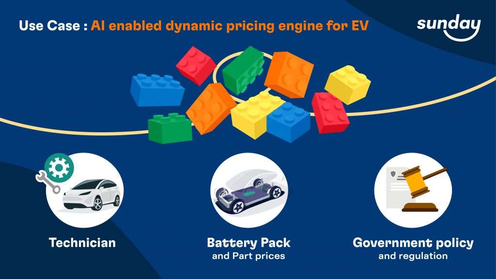 ปฏิเสธไม่ได้เลยว่าอุตสาหกรรมประกันเป็นหนึ่งในอุตสาหกรรมที่มีการเปลี่ยนแปลงอยู่ตลอดเวลา ไม่ว่าจะเป็นข้อกำหนดจากภาครัฐหรือการสนับสนุนต่างๆ ทำให้โมเดลการคำนวณเบี้ยประกันต้องมีความยืดหยุ่น เพื่อให้การคำนวณเบี้ยประกันสามารถทำได้อย่างเรียลไทม์ ซันเดย์เลยใช้เลโก้โมเดล กล่าวคือ ทุกปัจจัยที่มีส่วนในการคำนวณเบี้ยประกันภัยสามารถปรับ เสริม เติมแต่ง ได้อย่างรวดเร็วโดยไม่จำเป็นต้องเริ่มนับหนึ่งใหม่เหมือนบริษัทประกันทั่วไป ยกตัวอย่าง ประกันรถไฟฟ้า มีความเสี่ยงใหม่ที่เกิดขึ้นนั้นก็คือ ค่าแรงของช่างซ่อมเฉพาะทาง (Technician cost) ที่อาจจะมีราคาสูงกว่าช่างซ่อมรถสันดาปทั่วไป ราคาแบตเตอรี่ที่สูงขึ้น การลดภาษีของกรมสรรพสามิตการนำเข้าแบตเตอรี่ ซึ่งการเปลี่ยนแปลงเหล่านี้ มีผลต่อการคำนวณเบี้ยประกันรถไฟฟ้า ซึ่งซันเดย์สามารถนำปัจจัยเหล่านี้ที่มีการเปลี่ยนแปลงเข้าไปในระบบการคำนวณเบี้ยประกันได้ทันที ทำให้ผู้บริโภคสามารถได้รับค่าเบี้ยที่เหมาะสมและถูกต้องอย่างรวดเร็ว
