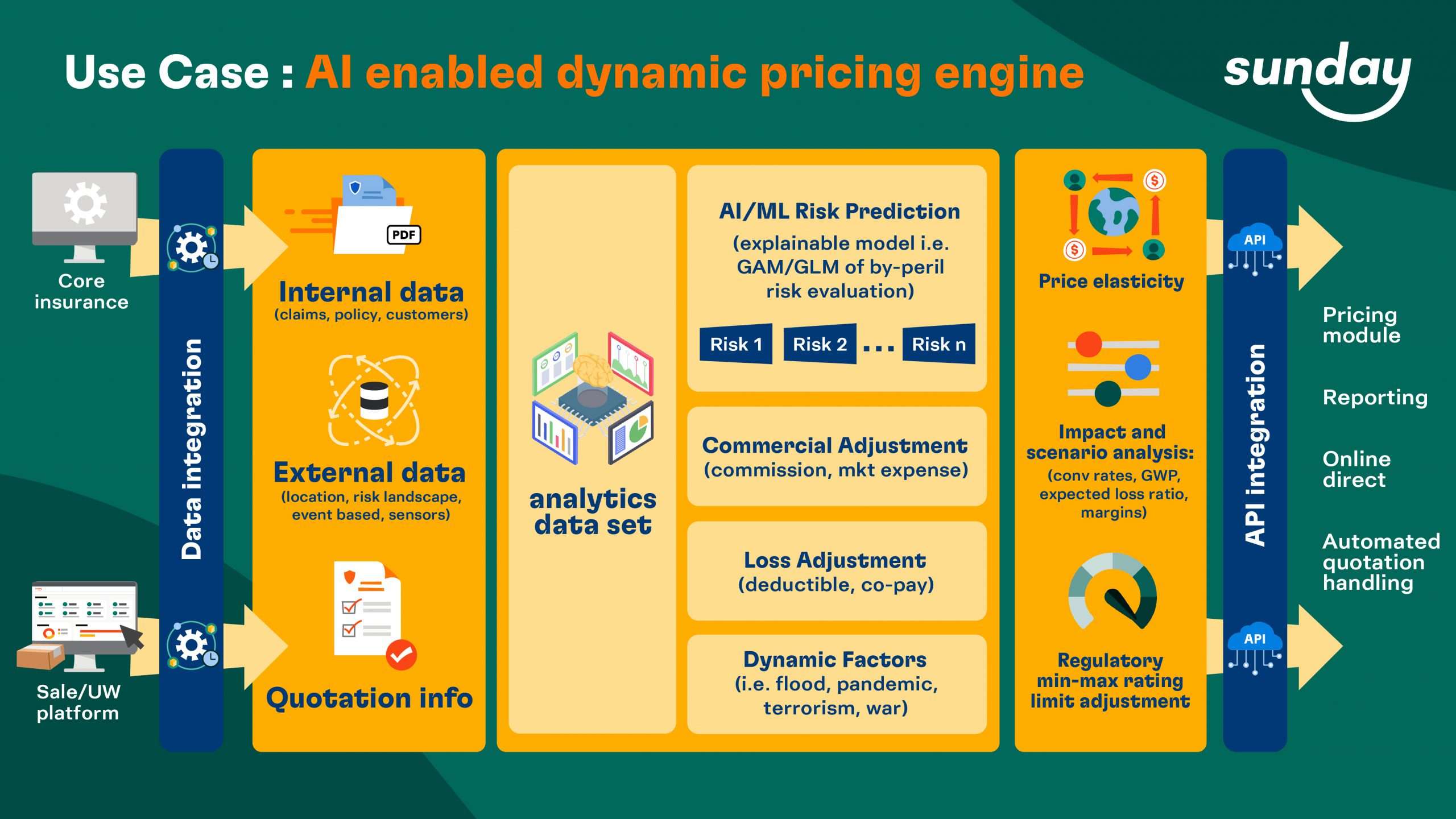 AI เฟืองสำคัญของวงการประกันภัยยุคใหม่บริษัทประกันโดยทั่วไปจะคิดเบี้ยประกันจากการการนำความเสี่ยงของทุกคนมาเฉลี่ยเพื่อหาเบี้ยประกัน ซึ่งในความเป็นจริงแล้ว ทุกคนมีความเสี่ยงที่แตกต่างกัน ซันเดย์เล็งเห็นถึงความแตกต่างนี้จึงได้ นำ AI เข้ามาช่วยวิเคราะห์เบี้ยประกันเพียงไม่กี่วินาทีคุณก็สามารถได้ราคาเบี้ยประกันที่ถูกออกแบบมาเพื่อคุณ โดยเฉพาะ ซันเดย์คำนวณค่าเบี้ยจากข้อมูลภายใน (Internal data) เช่น ข้อมูลการเคลมและข้อมูลที่คุณ กรอกผ่านเว็บไซต์ และข้อมูลภายนอก (External data) เช่นที่อยู่ โดยนำข้อมูลเหล่านี้มาคำนวณ (Analytic data set) ซึ่งหลังจากคำนวณแล้ว AI จะดักจับความเสี่ยงของคุณเพื่อคำนวณทุนเบี้ยประกัน ยกตัวอย่างเช่น บริเวณที่คุณอาศัยมีทางโค้งอันตรายหรือไม่ คุณอยู่ในพื้นที่เสี่ยงน้ำท่วมหรือไม่ รวมไปถึงอัตราการเกิดอุบัติเหตุในละแวกที่คุณอยู่ โดยทุนประกันของคุณจะถูกลด ปรับ เพิ่มผ่านปัจจัยต่างๆ เช่น การติดตั้งกล้องโปรโมชัน รวมไปถึงภัยพิบัติต่างๆ ที่อาจจะเกิดขึ้น โดยราคาค่าเบี้ยประกันยังอยู่ในข้อกำหนดของคปภ.
