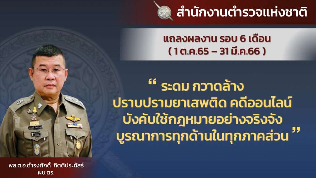 พล.ต.ท.อาชยน กล่าวว่า พล.ต.อ.ดำรงศักดิ์ กิตติประภัสร์ ผู้บัญชาการตำรวจแห่งชาติ (ผบ.ตร.) ได้ขับเคลื่อนนโยบายสำคัญของรัฐบาล โดยเฉพาะด้านอาชญากรรม ที่ส่งผลกระทบต่อประชาชนด้านคดียาเสพติด คดีออนไลน์ บังคับใช้กฎหมายอย่างเฉียบขาด จริงจัง บังคับใช้ทุกมาตรการทางกฎหมาย ยังคงนโยบาย ผบ.ตร. (10 ข้อ) โดยเฉพาะการ พิทักษ์ เทิดทูน และเทิดพระเกียรติต่อสถาบันพระมหากษัตริย์ การยกระดับการบริการประชาชน แก้ไขปัญหาอาชญากรรมที่สร้างความเดือดร้อนต่อประชาชน แก้ไขปัญหายาเสพติดทุกมิติ และอาชญากรรมออนไลน์ โดยมีผลการดำเนินการ ตั้งแต่วันที่ 1 ต.ค.65 – 31 มี.ค.66 ดังนี้