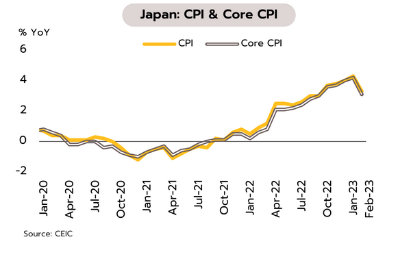 รายได้ที่แท้จริงที่หดตัวเร็วอาจเพิ่มความเสี่ยงต่อการบริโภคภายในประเทศ แต่คาดเศรษฐกิจฟื้นตัวในช่วงครึ่งปีหลังจากผลของเงินเฟ้อที่ชะลอลง ในเดือนกุมภาพันธ์ ดัชนีราคาผู้บริโภคพื้นฐานอยู่ที่ 3.1% YoY ลดลงจากระดับสูงสุดในรอบ 41 ปีที่ 4.2% ในเดือนมกราคม และเป็นการชะลอตัวลงเป็นครั้งแรกในรอบ 13 เดือน ขณะที่ตัวเลขกำไรก่อนหักภาษีของบริษัทญี่ปุ่นลดลง 2.8% YoY ในไตรมาส 4/2565 ซึ่งเป็นการปรับตัวลงครั้งแรกในรอบ 8 ไตรมาสจากผลกระทบของต้นทุนพลังงานและวัตถุดิบที่ปรับตัวสูงขึ้น