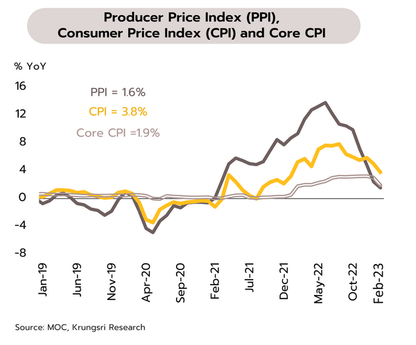 (ii) ดัชนีราคาผู้ผลิตที่บรรเทาลงเหลือเพียง 1.6% ในเดือนกุมภาพันธ์ กอปรกับอัตราเงินเฟ้อทั่วไปมีแนวโน้มจะลดลงเข้าสู่กรอบเป้าหมาย 1-3% ของ ธปท. ภายในเดือนมิถุนายน จาก 3.8% ในเดือนล่าสุด ส่วนอัตราเงินเฟ้อพื้นฐานอยู่ที่ 1.9% ลดลงมากจาก 3.0% ในเดือนมกราคม และมีแนวโน้มทรงตัวต่ำกว่า 2% ในช่วงที่เหลือของปีนี้ สะท้อนว่าอัตราเงินเฟ้อพื้นฐานอาจต่ำกว่าที่ธปท.คาดการณ์ไว้ที่ 2.4% ในปีนี้ และ