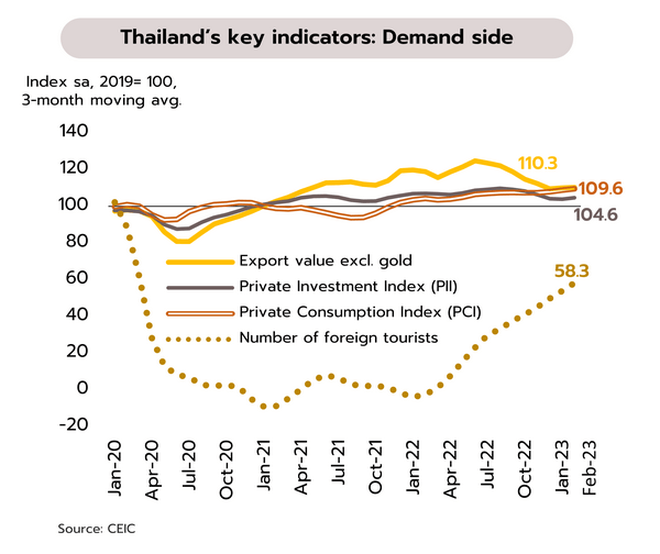 จากเครื่องชี้เศรษฐกิจในสองเดือนแรกของปีนี้สะท้อนถึงเศรษฐกิจที่ยังได้แรงหนุนสำคัญจากการฟื้นตัวของภาคท่องเที่ยว และการเติบโตของอุปสงค์ในประเทศ ซึ่งน่าจะช่วยขับเคลื่อนเศรษฐกิจไตรมาสแรกของปีสามารถหลีกเลี่ยงภาวะถดถอยได้ ในระยะถัดไปปัจจัยบวกจากกิจกรรมการเลือกตั้งที่จะเกิดขึ้นจะมีส่วนช่วยให้มีเม็ดเงินหมุนเวียนในระบบเศรษฐกิจมากขึ้น อย่างไรก็ตาม ภาคส่งออกยังมีแนวโน้มอ่อนแอท่ามกลางการชะลอตัวของภาวะเศรษฐกิจโลก โดยเฉพาะเศรษฐกิจประเทศแกนหลักที่มีแนวโน้มชะลอตัวและแรงกดดันจากอัตราดอกเบี้ยที่เพิ่มขึ้นสู่ระดับสูงสุดในรอบ 15 ปี ขณะที่ความกังวลปัญหาในภาคสถาบันการเงินที่ยังมีอยู่ แม้ความเสี่ยงจะเริ่มลดลงในระยะนี้