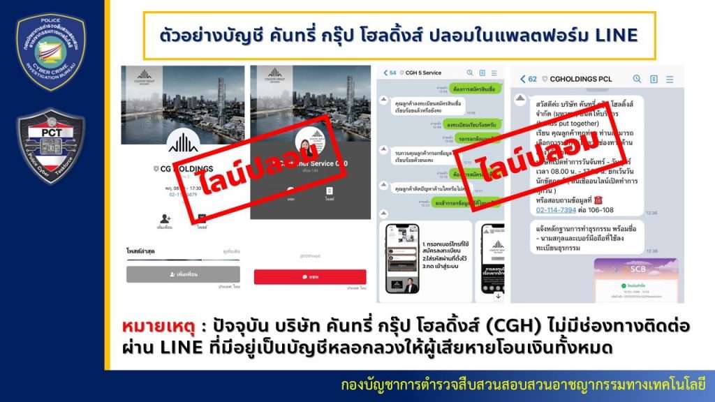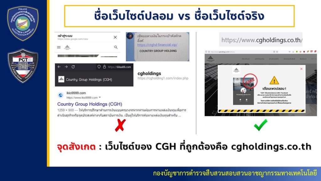 ได้รับรายงานจากกองบังคับการตรวจสอบและวิเคราะห์อาชญากรรมทางเทคโนโลยี (บก.ตอท.) ว่าที่ผ่านมามีผู้เสียหายหลายรายถูกมิจฉาชีพหลอกลวงให้กู้เงินผ่านเว็บไซต์ของ บริษัท คันทรี่ กรุ๊ป โฮลดิ้งส์ จำกัด (Country Group Holdings) ซึ่งถูกปลอมขึ้นมาให้คล้ายกับเว็บไซต์จริง โดยก่อนเกิดเหตุผู้เสียหายได้เข้าเว็บไซต์ค้นหาแหล่งกู้เงินออนไลน์ ทำให้เจอเว็บไซต์ปลอมดังกล่าว มีการแอบอ้างว่าเป็นผู้ให้บริการด้านการเงินแบบครบวงจร สมัครง่าย ให้วงเงินไม่อั้น อนุมัติเร็ว ดอกเบี้ยต่ำ ไม่ตรวจสอบเครดิตบูโร ใช้เอกสารน้อย ปลอดภัย และมีกฎหมาย PDPA คุ้มครอง เป็นต้น จากนั้นเมื่อผู้เสียหายเพิ่มเพื่อนทางไลน์เพื่อติดต่อไปขอรายละเอียด เจ้าหน้าที่ปลอมจะขอข้อมูลส่วนตัว ภาพบัตรประชาชน เลขที่บัญชีธนาคาร แล้วทำสัญญากู้เงินปลอม เสร็จแล้วจะให้ผู้เสียหายโอนเงินอ้างว่าเป็นค่าธรรมเนียม ค่าเบี้ยประกัน หรือค่าอื่นๆ กระทั่งผู้เสียหายหลงเชื่อโอนเงินไปแล้ว มิจฉาชีพก็อ้างเหตุผลต่างๆ เพื่อให้ผู้เสียหายโอนเงินมาเพิ่มอีก เช่น โอนเงินผิดบัญชี โอนเงินเกินเวลาที่กำหนด หรือทำธุรกรรมผิดพลาด จะต้องติดต่อไปยังไลน์ของธนาคารแห่งประเทศไทยปลอม เมื่อผู้เสียหายติดต่อเข้าไปก็จะถูกข่มขู่ว่ากระทำผิดกฎหมาย ให้ทำการโอนเงินมาเพิ่มอีก ผู้เสียหายเชื่อว่าถูกหลอกลวงจึงมาแจ้งความร้องทุกข์ต่อพนักงานสอบสวนให้ดำเนินคดีกับผู้กระทำผิดตามกฎหมาย