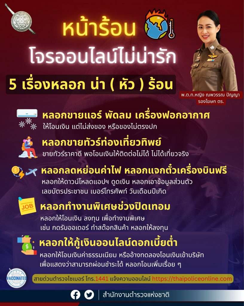 พ.ต.ท.หญิง ณพวรรณฯ กล่าวอีกว่า ปัจจุบันโจรออนไลน์มักจะออกอุบายตามเทศกาลวันสำคัญตามประเพณี ในช่วงฤดูร้อนนี้ จึงขอแจ้งเตือนถึงรูปแบบอาชญากรรมออนไลน์ที่โจรอาจใช้ในการหลอกลวง ดังนี้