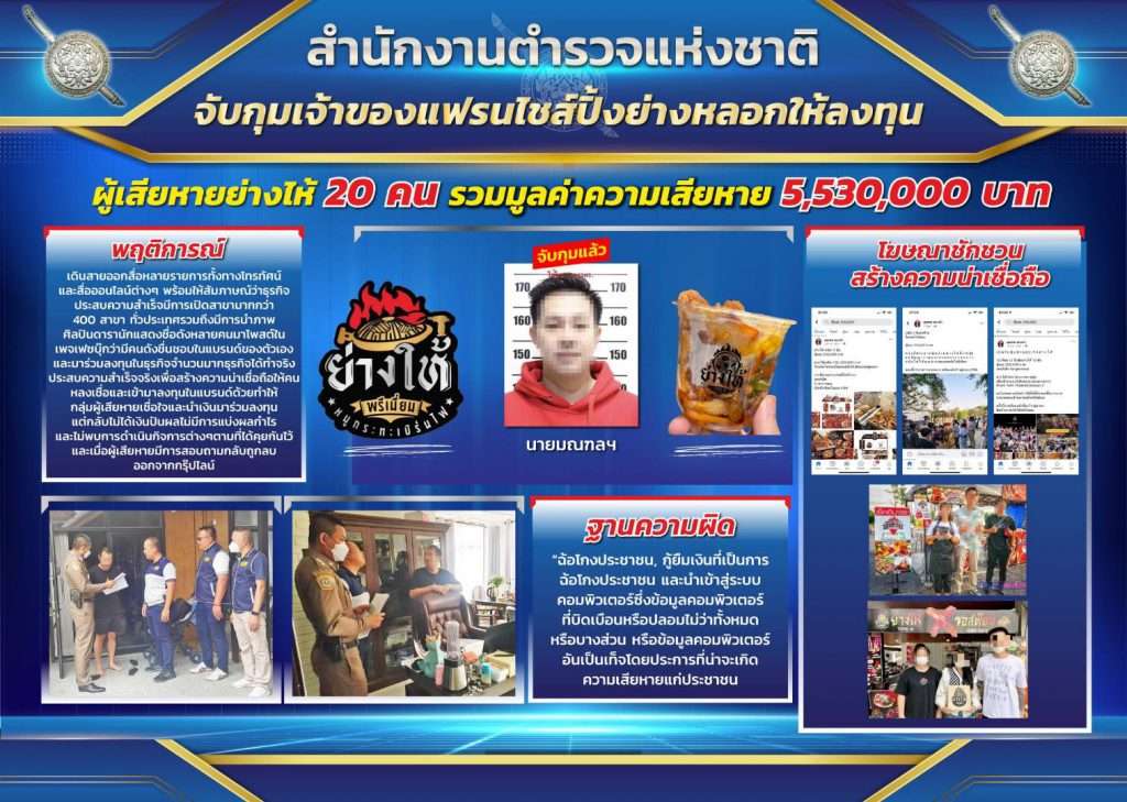 พล.ต.อ.สุรเชษฐ์ แถลงจับกุม เจ้าของแฟรนไชส์ปิ้งย่าง “ย่างให้”หลอกลวงให้ร่วมลงทุนความเสียหายกว่าห้าล้านบาท