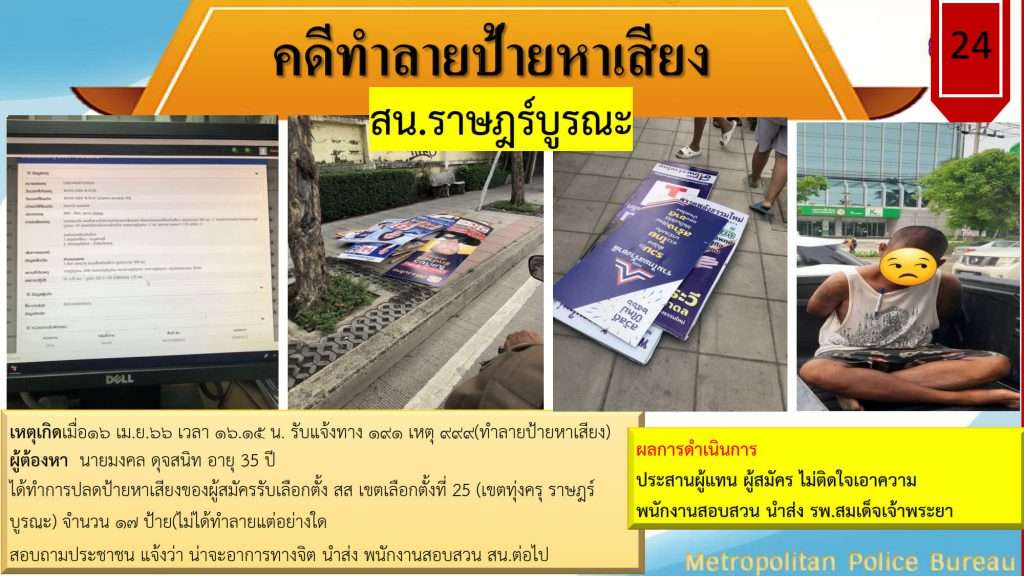 ศูนย์รักษาความปลอดภัยและความสงบเรียบร้อยการจัดการเลือกตั้ง สำนักงานตำรวจแห่งชาติ สรุปจำนวนคดีและผลคำพิพากษาของศาลเกี่ยวกับการทำลายป้ายหาเสียง