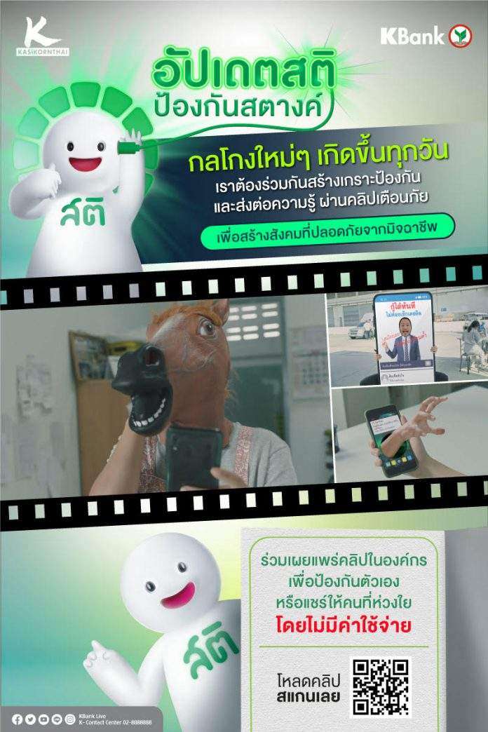เคแบงก์ เตือนภัยมิจฉาชีพหลอกเงินที่สร้างความเสียหายกับประชาชนกว่า 31,000 ล้านบาท เร่งให้ความรู้และวางมาตรการป้องกันภัยคุกคามทางการเงิน ผ่านแคมเปญ #อัปเดตสติป้องกันสตางค์ พร้อมเชิญชวนประชาชนและหน่วยงานต่างๆ ร่วมเป็นแนวร่วมเผยแพร่ข้อมูล ช่วยสร้างสังคมรู้ทันภัยมิจฉาชีพหลอกเอาเงินที่ใช้วิธีแนบเนียนมากยิ่งขึ้น ออกคลิป เตือนภัย 3 กลโกงที่ยังมีเหยื่อโดนหลอกต่อเนื่อง พลาดท่าเสียทั้งเงิน และมีคดีติดตัว ได้แก่