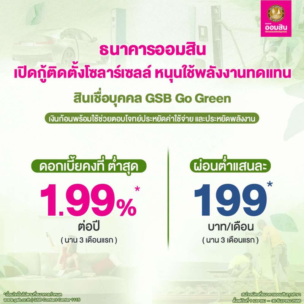 สินเชื่อ GSB Go Green สำหรับผู้กู้ที่เป็นบุคคลธรรมดา อายุ 20 ปี และเมื่อรวมอายุผู้กู้กับระยะเวลาชำระเงินกู้ต้องไม่เกิน 70 ปี วัตถุประสงค์เพื่อติดตั้งหรือซื้ออุปกรณ์ที่ช่วยลดมลภาวะ เช่น Solar cell, Solar rooftop ติดตั้ง EV Charger สำหรับรถยนต์ไฟฟ้า ซื้อรถยนต์ไฟฟ้า (EV) รถยนต์ไฮบริด รถจักรยานยนต์ไฟฟ้า ซื้อเครื่องใช้ไฟฟ้าเบอร์ 5 ที่ช่วยประหยัดพลังงาน รวมถึงค่าใช้จ่ายอื่น ๆ ที่เกี่ยวเนื่อง กรณีไม่มีหลักประกัน (Clean Loan) ให้กู้ไม่เกิน 10 เท่าของรายได้รวมสูงสุดไม่เกินรายละ 500,000 บาท ชำระเงินกู้ไม่เกิน 7 ปี อัตราดอกเบี้ยคงที่ต่ำสุด 7.99% และเงินงวดผ่อนต่ำแสนละ 799 บาทต่อเดือน นาน 3 เดือนแรก หากใช้หลักทรัพย์ค้ำประกัน ได้แก่ บ้านพร้อมที่ดิน คอนโดฯ ที่ดินเปล่า ให้กู้สูงสุดไม่เกิน 5 ล้านบาท ผ่อนชำระไม่เกิน 30 ปี ดอกเบี้ยคงที่ต่ำสุด 1.99% และเงินงวดผ่อนต่ำแสนละ 199 บาทต่อเดือน นาน 3 เดือนแรก โดยธนาคารจัดอัตราดอกเบี้ยและเงื่อนไขพิเศษนี้ไปจนถึงวันที่ 30 ธ.ค. 2566 นี้เท่านั้น