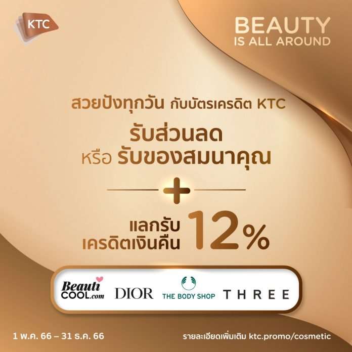 “เมื่อปัจจัยต่างๆ เอื้ออำนวยให้กลไกทางธุรกิจทุกอย่างกลับสู่สภาวะปกติ ผู้คนใช้ชีวิตได้อย่างอิสระและมีความสุขตาม ไลฟ์สไตล์ที่ชื่นชอบ เคทีซีจึงเห็นโอกาสในการทำตลาด โดยได้ร่วมกับ 4 พันธมิตรในหมวดเครื่องสำอางชั้นนำ ได้แก่ ดิออร์ บิวติ้คูล เดอะ บอดี้ ชอป และทรี เพื่อมอบสิทธิพิเศษให้กับสมาชิกได้ดูแลผิวสวย และแต่งแต้มสีสันที่บ่งบอกสไตล์ของตนเอง ดังนี้ ดิออร์ (Dior) รับลิปสติก (Addict Lip Maximizer 001 miniature) ขนาด 2 มล. เมื่อช้อปออนไลน์ผ่าน shop.dior.co.th ครบ 3,500 บาท ขึ้นไปต่อรายการ และใส่โค้ด “KTCDIOR” ตั้งแต่วันที่ 1 พฤษภาคม 2566 – 31 กรกฎาคม 2566 บิวติ้คูล (Beauticool) รับส่วนลดสูงสุด 250 บาท เมื่อช้อปออนไลน์ผ่าน www.beauticool.com ตั้งแต่วันที่ 1 พฤษภาคม 2566 – 31 ธันวาคม 2566 พิเศษสมาชิกใหม่บิวติ้คูล รับส่วนลด 150 บาท เมื่อช้อปครบ 1,500 บาทขึ้นไปต่อรายการ และใส่โค้ด “KTCBTC150” รับส่วนลด 100 บาท เมื่อช้อปครบ 1,100 บาทขึ้นไปต่อรายการ และใส่โค้ด “KTCBTC100” เดอะ บอดี้ ชอป (The Body Shop) รับส่วนลด 300 บาท เมื่อ ช้อปออนไลน์ผ่าน www.thebodyshop.co.th ครบ 2,000 บาท ขึ้นไปต่อรายการ และใส่โค้ด “TBSXKTC” ตั้งแต่วันที่ 1 พฤษภาคม 2566 – 31 กรกฎาคม 2566 ทรี (THREE) รับ Three Balancing Cleansing Oil N (ขนาด 10 มล. มูลค่า 250 บาท) เมื่อช้อปออนไลน์ผ่าน www.threecosmetics-th.com ไม่กำหนดยอดซื้อขั้นต่ำ และใส่โค้ด “KTCTHREE” ระหว่างวันที่ 1 พฤษภาคม 2566 – 31 กรกฎาคม 2566”