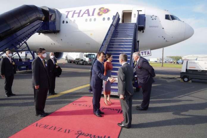 เมื่อวันที่ 4 พ.ค.66 (เวลา 08.03 น.)ตามเวลาท้องถิ่นของกรุงลอนดอน สหราชอาณาจักร ซึ่งช้ากว่าเวลาประเทศไทย 6 ชั่วโมง พระบาทสมเด็จพระเจ้าอยู่หัว และสมเด็จพระนางเจ้าฯ พระบรมราชินี ประทับเครื่องบินพระที่นั่งของบริษัท การบินไทย จำกัด (มหาชน) เที่ยวบินที่ TG 8886 เสด็จพระราชดำเนินถึงยังท่าอากาศยานลอนดอน สแตนสเต็ด