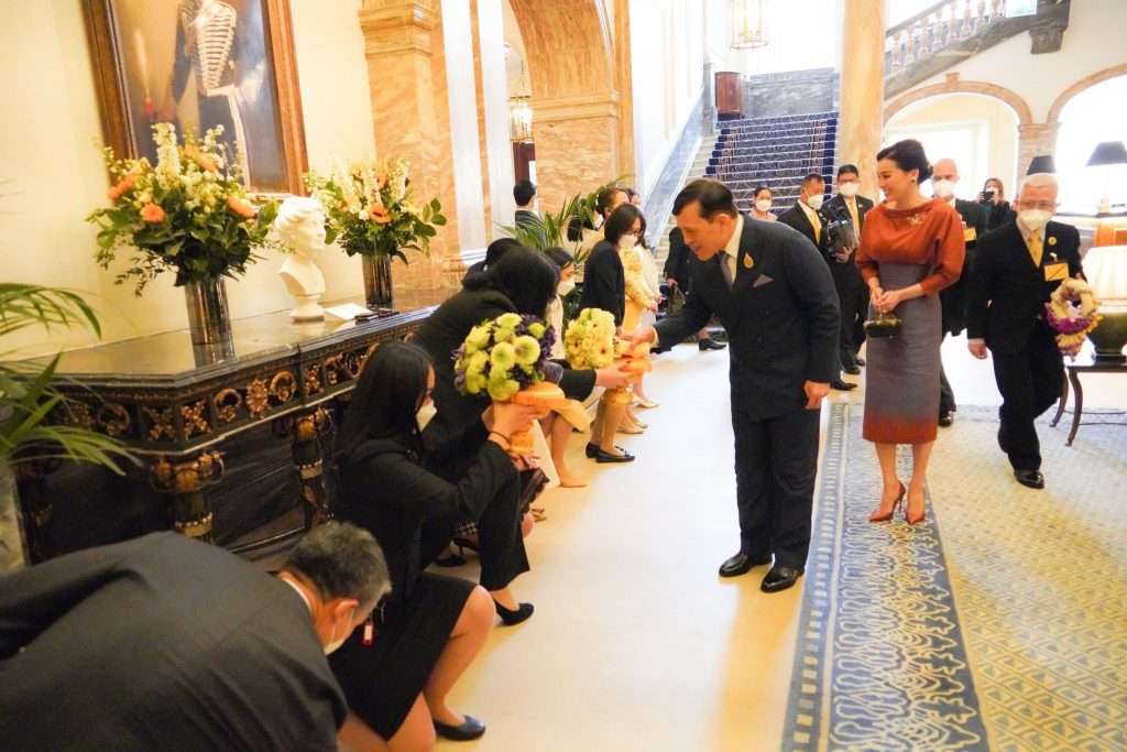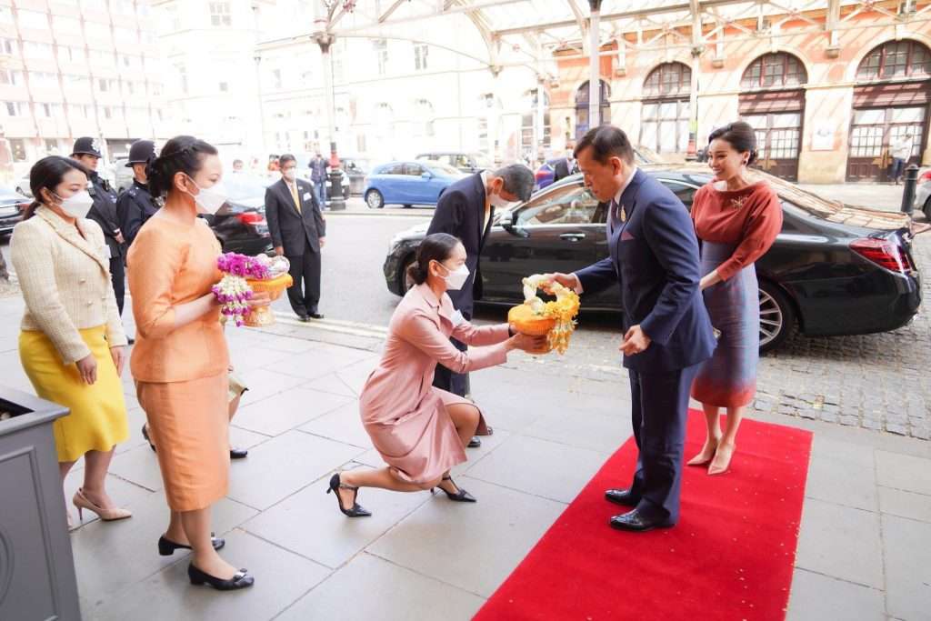 โดยมีนายธานี ทองภักดี เอกอัครราชทูต ณ กรุงลอนดอน นายไซม่อน ไบซ์ ผู้แทนพระองค์สมเด็จพระเจ้าชาลส์ที่ 3 แห่งสหราชอาณาจักรบริเตนใหญ่และไอร์แลนด์เหนือ นายไมเคิล จอห์น ฮอลโลเวย์ ผู้แทนพิเศษของรัฐมนตรีว่ากระทรวงการต่างประเทศและการพัฒนา สหราชอาณาจักร เฝ้าทูลละอองธุลีพระบาทรับเสด็จ