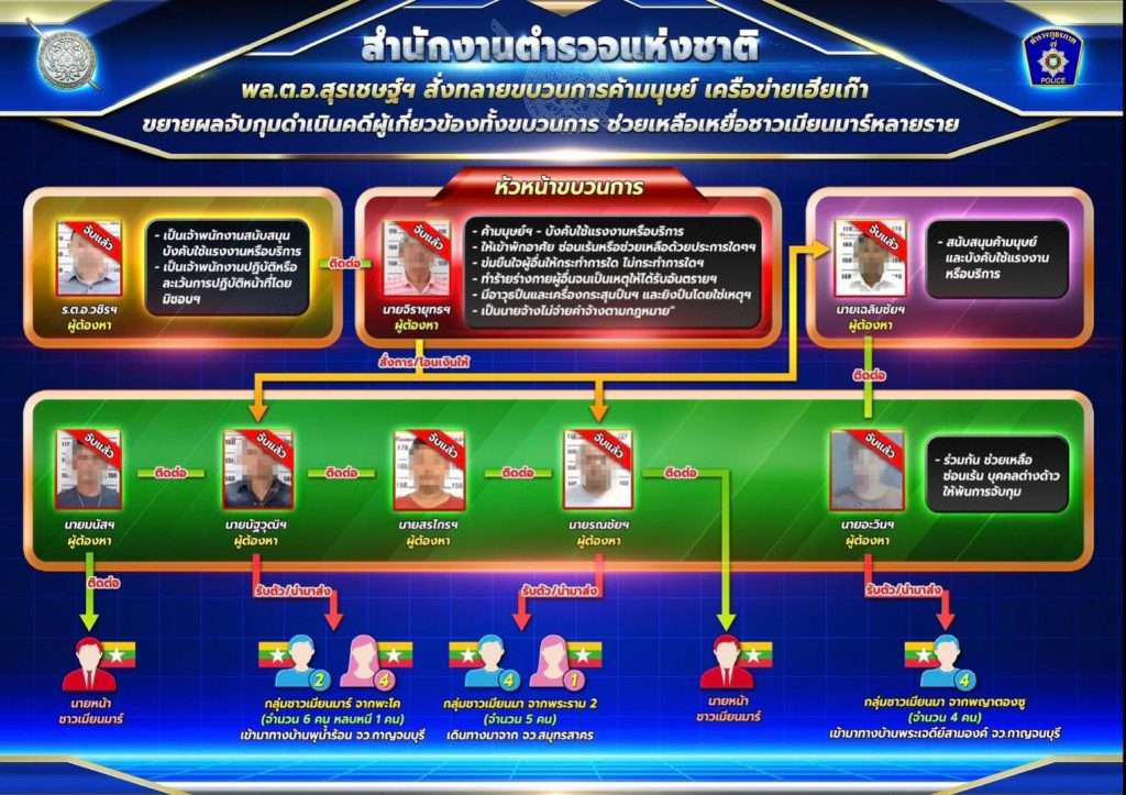 กรณีดังกล่าว พล.ต.อ.สุรเชษฐ์ หักพาล รอง ผบ.ตร. ในฐานะ ผอ.ศพดส.ตร. ได้สั่งการให้ สภ.เมืองกาญจนบุรี ดำเนินการสืบสวนรวบรวมพยานหลักฐานดำเนินคดีในความผิดฐานค้ามนุษย์ รวมทั้งสืบสวนขยายผลดำเนินคดีกับผู้เกี่ยวข้องทั้งกระบวนการให้ครบถ้วน จากการสืบสวนพบว่า นายจิรายุทธ เฉลิมศุภเศรษฐ์ นายจ้าง ได้รับแรงงานต่างด้าวเข้ามาทำงานจากผู้รับจ้างขนแรงงานผิดกฎหมาย จากนั้นได้บังคับให้ทำงานในไร่อ้อย โดยยึดเอกสารประจำตัวทั้งหมด และมีการข่มขู่โดยใช้ทั้งอาวุธมีดและอาวุธปืน ทำให้แรงงานหวาดกลัวและยอมทำงาน โดยต้องทำงานทุกวันไม่มีวันหยุด และได้เงินสัปดาห์ละ 500 บาทต่อคน และต้องพักอาศัยด้วยกันอย่างแออัด เจ้าหน้าที่ตำรวจจึงได้รวบรวมพยานหลักฐานดำเนินคดีกับผู้ต้องหารวมจำนวน 9 คน แบ่งเป็นนายจ้าง 1 ราย ผู้สนับสนุน 2 ราย และคนนำพาต่างด้าวเขามาทำงานจำนวน 6 ราย ประกอบด้วย