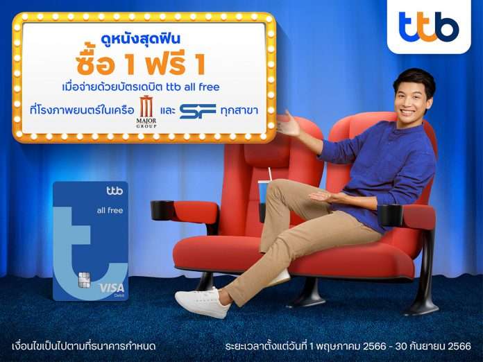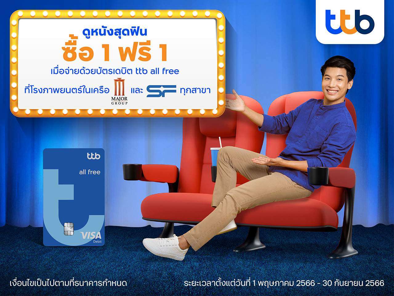 ทีเอ็มบีธนชาต หรือ ทีทีบี ร่วมกับ โรงภาพยนตร์ในเครือเมเจอร์ และ เอส เอฟ ทุกสาขา (ยกเว้น เอส เอฟ สาขา Emprive Cineclub) มอบสิทธิพิเศษสำหรับลูกค้าบัญชี ttb all free เมื่อซื้อบัตรชมภาพยนตร์ในเครือเมเจอร์และ เอส เอฟ ทุกสาขา ที่ตู้ E-Ticket และชำระด้วยบัตรเดบิต ttb all free ซื้อบัตรชมภาพยนตร์ 1 ที่นั่ง รับฟรีอีก 1 ที่นั่ง สำหรับที่นั่งปกติ ระหว่างวันที่ 1 พฤษภาคม–30 กันยายน 2566 นี้ โดยมีจำนวนสิทธิ์สำหรับโรงภาพยนตร์เมเจอร์ 1,000 สิทธิ์ ต่อเดือน โรงภาพยนตร์เอส เอฟ 1,000 สิทธิ์ ต่อเดือน และจำกัด 2 สิทธิ์ ต่อบัตรเดบิต 1 ใบ ต่อเดือน โดยลูกค้าต้องตรวจสอบสิทธิ์คงเหลือในแต่ละเดือน และตรวจสอบเงื่อนไขเพิ่มเติม ณ โรงภาพยนตร์ในเครือเมเจอร์ และ เอส เอฟ ก่อนใช้บริการทุกครั้ง