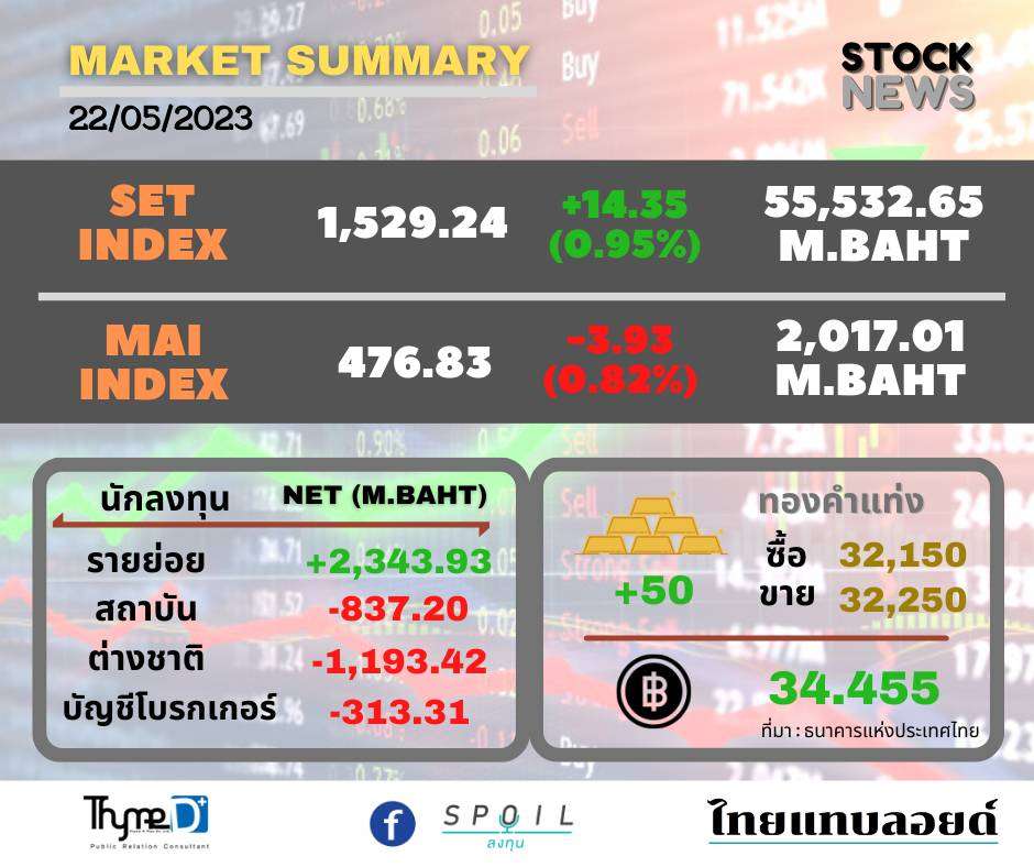 SET ปิดวันนี้ที่ 1,529.24 จุด เพิ่มขึ้น 14.35 จุด (+0.95%) มูลค่าการซื้อขาย 55,532.65 ล้านบาท
