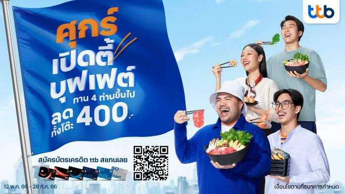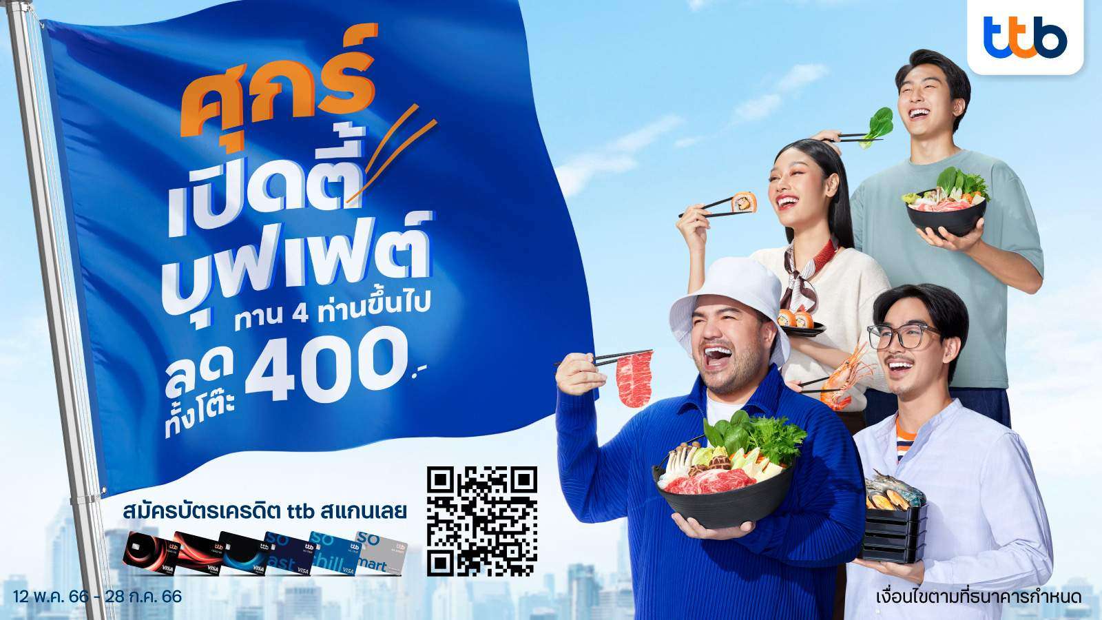 หลังจากทีเอ็มบีธนชาต หรือ ทีทีบี ได้มอบสิทธิประโยชน์ดี ๆ ในเรื่องการกินให้กับผู้ถือบัตรเครดิต ttb ให้ทุกมื้อคุ้มค่ามากยิ่งขึ้น ประเดิมออกโปรโมชันเด็ด “ศุกร์เปิดตี้บุฟเฟต์” ลดทั้งโต๊ะเพิ่มทันที 400 บาท ในแคมเปญ “กินจริงจัง กับบัตรเครดิต ttb โดยมี “โอ๊ต-ปราโมทย์ ปาทาน” นักร้องและอินฟลูเอนเซอร์ชื่อดังร่วมส่งโปรโมชันไปเมื่อ 12 พฤษภาคม 2566 ที่ผ่านมา ปรากฏว่า ได้การตอบรับแบบถล่มทลายจากเหล่านักชิมสายบุฟเฟต์ ต่างพร้อมใจกันมาเปิดตี้ยืนรอต่อคิวเพื่อเข้าใช้บริการร้านบุฟเฟต์ชั้นนำ ซึ่งเป็นหนึ่งในกว่า 1,500 ร้านพันธมิตรที่เข้าร่วมโปรโมชันร้านอาหารกับบัตรเครดิต ttb