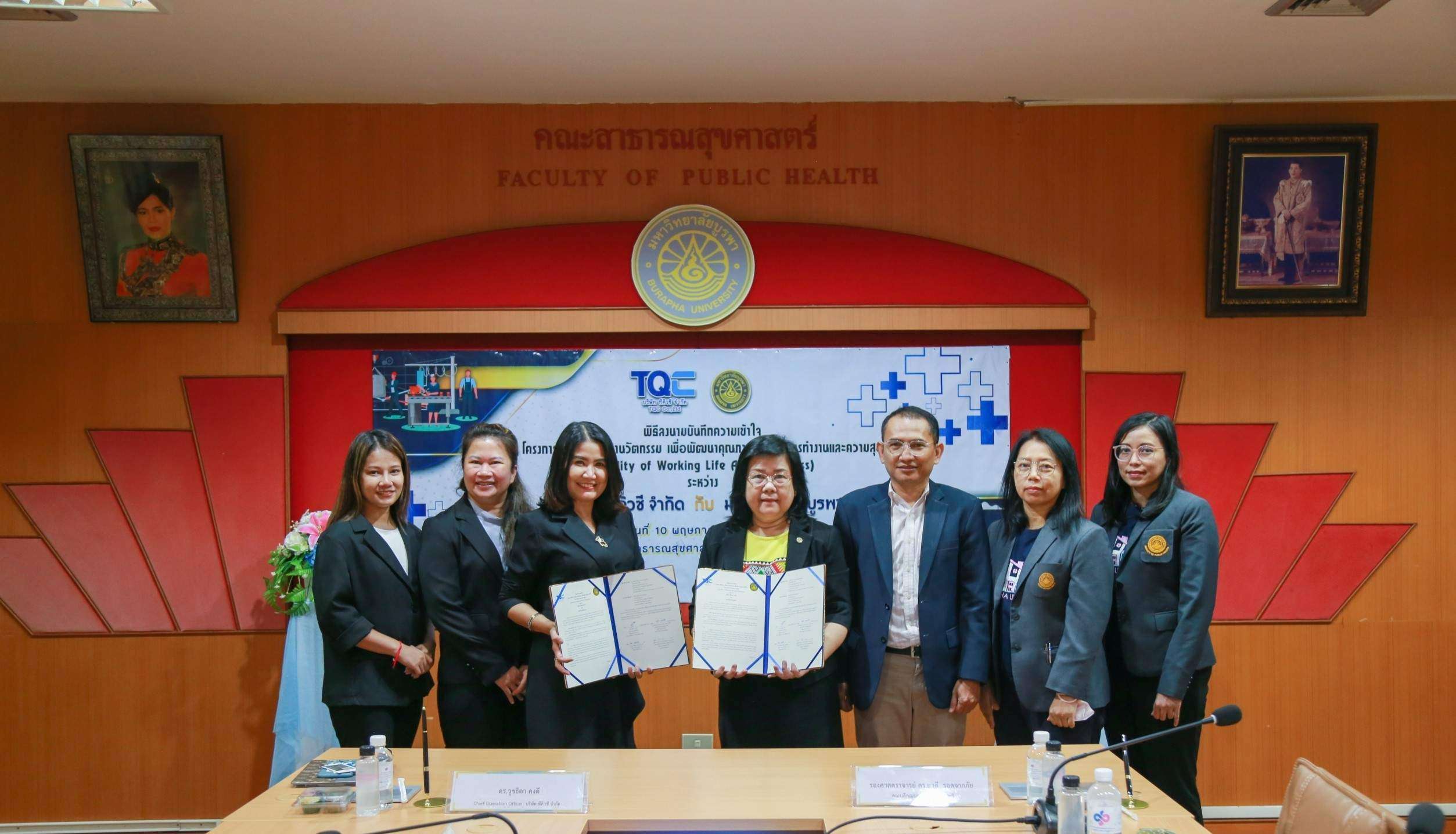 มหาวิทยาลัยบูรพา โดย รศ.ดร.ยุวดี รอดจากภัย คณบดีคณะสาธารณสุขศาสตร์ และ ผศ.ดร. โกวิท สุวรรณหงษ์ รองคณบดีฝ่ายบริการวิชาการและนวัตกรรม คณะสาธารณสุขศาสตร์ และบริษัท ทีคิวซี จำกัด โดย ดร.วุชธิตา คงดี ประธานฝ่ายปฏิบัติการ ร่วมลงนามในบันทึกข้อตกลงความร่วมมือ ทางวิชาการ โครงการศึกษาและพัฒนาด้านนวัตกรรม เพื่อพัฒนาคุณภาพชีวิตในการทำงานและความสุข ภายใต้แนวคิด Quality Of Working Life And Happiness