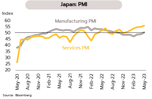 ผลบวกจากการเปิดประเทศช่วยกระตุ้นการฟื้นตัวของภาคท่องเที่ยวและการบริโภคต่อเนื่อง และอาจเป็นปัจจัยที่ทำให้ BOJ ยุติมาตรการ YCC ในช่วงครึ่งปีหลัง ในเดือนมีนาคม ยอดสั่งซื้อเครื่องจักรพื้นฐานของญี่ปุ่นลดลง 3.5% YoY และลดลง 3.9% MoM ปรับตัวลงติดต่อกันเป็นเดือนที่ 2 ขณะที่ดัชนี PMI เบื้องต้น (Flash) ในเดือนพฤษภาคมออกมาดีกว่าคาดโดยภาคการผลิตขยายตัวเป็นครั้งแรกในรอบ 7 เดือนอยู่ที่ 50.8 ส่วน PMI ภาคบริการขยายตัวแตะระดับสูงสุดเป็นประวัติการณ์ที่ 56.3 ในส่วนของอัตราเงินเฟ้อทั่วไปและพื้นฐานในโตเกียวชะลอลงสู่ 3.2% YoY ต่ำสุดในรอบ 8 เดือน
