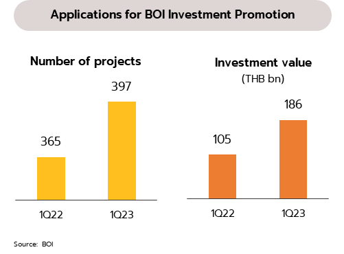 ยอดขอรับส่งเสริมการลงทุนจาก BOI ในไตรมาสแรกเติบโตสูง แต่ความไม่แน่นอนทางการเมืองในประเทศอาจกระทบต่อความเชื่อมั่นของการลงทุน โดย BOI รายงานในช่วงไตรมาส 1/2566 มีโครงการยื่นขอรับส่งเสริมการลงทุนรวมทั้งสิ้น 397 โครงการ เพิ่มขึ้น 9% YoY และมีมูลค่าเงินลงทุนรวม 185,730 ล้านบาท เพิ่มขึ้น 77% ซึ่งส่วนใหญ่เป็นการลงทุนในอุตสาหกรรมเป้าหมาย 205 โครงการ มูลค่า 154,414 ล้านบาท (คิดเป็น 83% ของมูลค่ารวมทั้งหมด) โดยอุตสาหกรรมที่มีมูลค่าเงินลงทุนสูง นำโดยอุตสาหกรรมเครื่องใช้ไฟฟ้าและอิเล็กทรอนิกส์ อาหารแปรรูป เคมีภัณฑ์ ยานยนต์และชิ้นส่วน