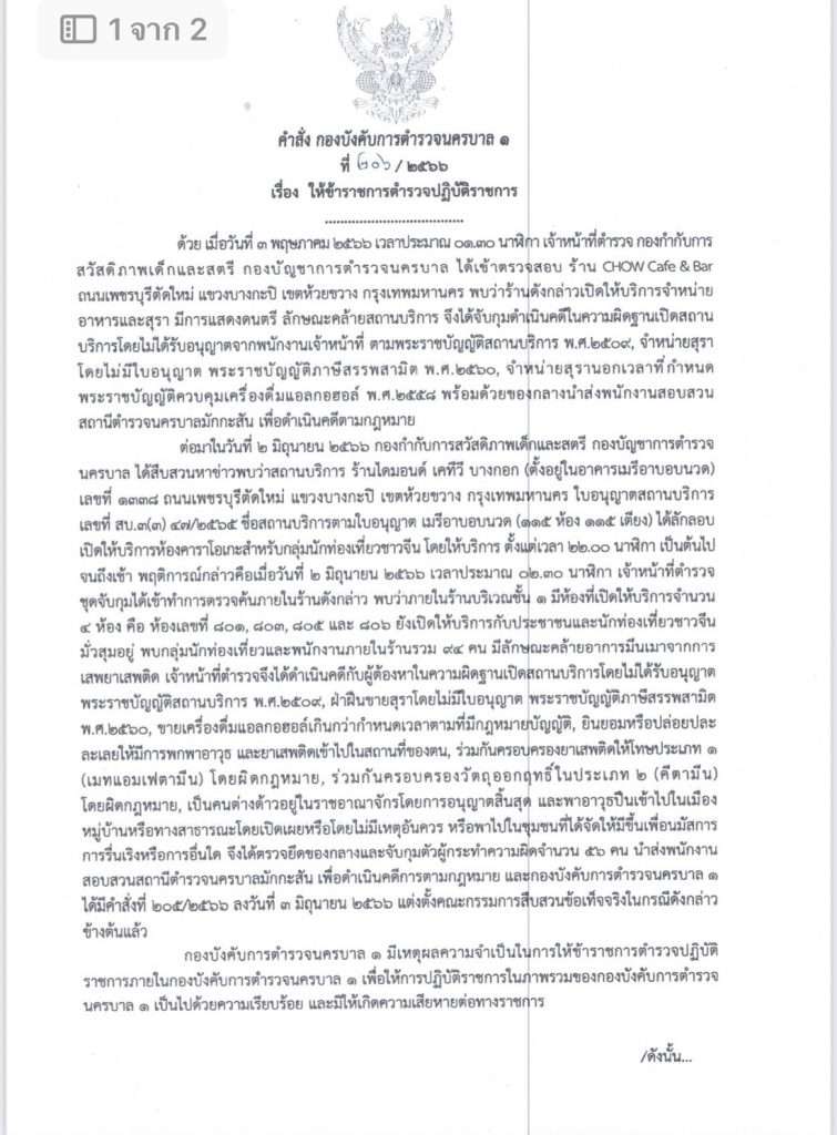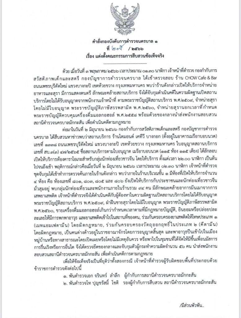 ด้วยเมื่อวันที่ 3 พฤษภาคม 2566 เวลาประมาณ 01.30 น. เจ้าหน้าที่ตำรวจกองกำกับการ สวัสดิภาพเด็กและสตรี กองบัญชาการตำรวจนครบาล ได้เข้าตรวจสอบ ร้าน CHOW Cafe & Bar ถนนเพชรบุรีตัดใหม่ แขวงบางกะปิ เขตห้วยขวาง กรุงเทพฯ พบว่าร้านดังกล่าวเปิดให้บริการจําหน่าย อาหารและสุรา มีการแสดงดนตรี ลักษณะคล้ายสถานบริการ จึงได้จับกุมดำเนินคดีในความผิดฐานเปิดสถาน บริการโดยไม่ได้รับอนุญาตจากพนักงานเจ้าหน้าที่ ตามพระราชบัญญัติสถานบริการ พ.ศ.2509, จำหน่ายสุรา โดยไม่มีใบอนุญาต พระราชบัญญัติภาษีสรรพสามิต พ.ศ. 2560, จำหน่ายสุรานอกเวลาที่กำหนด พระราชบัญญัติควบคุมเครื่องดื่มแอลกอฮอล์ พ.ศ. 2558 พร้อมด้วยของกลางนำส่งพนักงานสอบสวน สถานีตำรวจนครบาลมักกะสัน เพื่อดำเนินคดีตามกฎหมาย ต่อมาในวันที่ 2 มิถุนายน 2566 กองกำกับการสวัสดิภาพเด็กและสตรี กองบัญชาการตำรวจ นครบาล ได้สืบสวนหาข่าวพบว่าสถานบริการ ร้านไดมอนด์ เคทีวี บางกอก (ตั้งอยู่ในอาคารเมรีอาบอบนวด) เลขที่ 1338 ถนนเพชรบุรีตัดใหม่ แขวงบางกะปิ เขตห้วยขวาง กรุงเทพฯ ใบอนุญาตสถานบริการ เลขที่ สบ.3(3) 47/2565 ชื่อสถานบริการตามใบอนุญาต เมรีอาบอบนวด (115 ห้อง 115 เตียง) ได้ลักลอบเปิดให้บริการห้องคาราโอเกะสำหรับกลุ่มนักท่องเที่ยวชาวจีน โดยให้บริการ ตั้งแต่เวลา 22.00 น.เป็นต้น ไปจนถึงเช้า