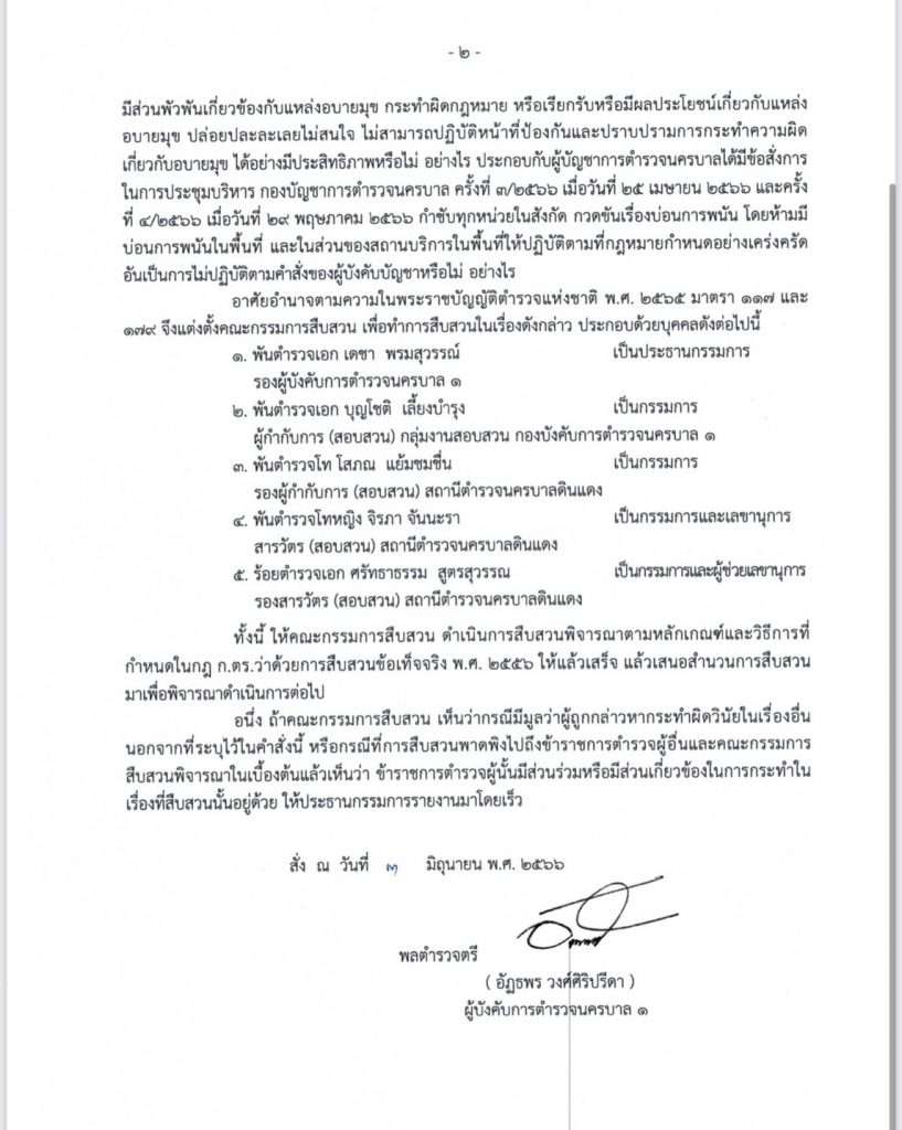มีส่วนพัวพันเกี่ยวข้องกับแหล่งอบายมุข กระทำผิดกฎหมาย หรือเรียกรับหรือมีผลประโยชน์เกี่ยวกับแหล่ง อบายมุข ปล่อยปละละเลยไม่สนใจ ไม่สามารถปฏิบัติหน้าที่ป้องกันและปราบปรามการกระทำความผิด เกี่ยวกับอบายมุข ได้อย่างมีประสิทธิภาพหรือไม่ อย่างไร ประกอบกับผู้บัญชาการตำรวจนครบาลได้มีข้อสั่งการ ในการประชุมบริหาร กองบัญชาการตำรวจนครบาล ครั้งที่ 3/2566 เมื่อวันที่ 25 เมษายน 2566 และครั้ง ที่ 4/2566 เมื่อวันที่ 29 พฤษภาคม 2566 กำชับทุกหน่วยในสังกัด กวดขันเรื่องบ่อนการพนัน โดยห้ามมี บ่อนการพนันในพื้นที่ และในส่วนของสถานบริการในพื้นที่ให้ปฏิบัติตามที่กฎหมายกำหนดอย่างเคร่งครัด อันเป็นการไม่ปฏิบัติตามคำสั่งของผู้บังคับบัญชาหรือไม่ อย่างไร อาศัยอำนาจตามความในพระราชบัญญัติตำรวจแห่งชาติ พ.ศ. 2565 มาตรา 117 และ 179 จึงแต่งตั้งคณะกรรมการสืบสวน เพื่อทำการสืบสวนในเรื่องดังกล่าว ประกอบด้วยบุคคลดังต่อไปนี้