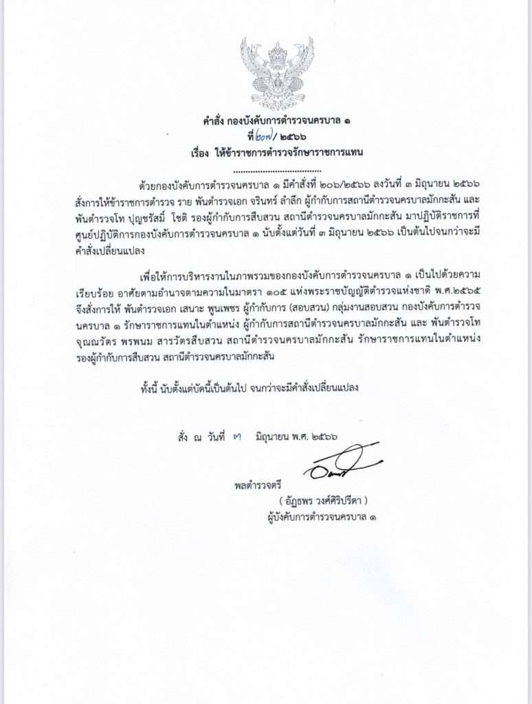 พล.ต.ต.อัฏฐพร วงศ์ศิริปรีดา ผู้บังคับการตำรวจนครบาล 1 ยังลงนามในคำสั่งคำสั่ง กองบังคับการตำรวจนครบาล 1 ที่ 207/2566 เรื่อง ให้ข้าราชการตำารวจรักษาราชการแทน โดยสั่งการให้ พ.ต.อ.เสนาะ พูนเพชร ผู้กำกับการ (สอบสวน) กลุ่มงานสอบสวน กองบังคับการตำรวจ นครบาล 1 รักษาราชการแทนในตำแหน่ง ผู้กำกับการสถานีตำรวจนครบาลมักกะสัน และพ.ต.ท.จุณณวัตร พรพนม สารวัตรสืบสวน สถานีตำรวจนครบาลมักกะสัน รักษาราชการแทนในตำแหน่ง รองผู้กำกับการสืบสวน สถานีตำรวจนครบาลมักกะสัน ทั้งนี้ นับตั้งแต่บัดนี้เป็นต้นไป จนกว่าจะมีคำสั่งเปลี่ยนแปลง