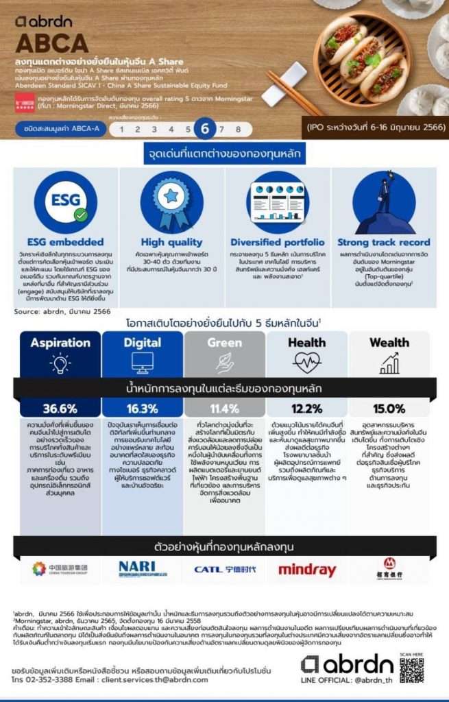 “บลจ.อเบอร์ดีน” เปิดตัว “กองทุนเปิด อเบอร์ดีน ไชน่า A Share ซัสเทนเนเบิล เอคควิตี้ ฟันด์ (ABCA)” เน้นลงทุนอย่างยั่งยืนในหุ้นจีนแผ่นดินใหญ่ ชูจุดเด่นที่แตกต่าง กองทุนหลักเฟ้นหุ้นคุณภาพ วิเคราะห์เชิงลึก ผนึก ESG ในกระบวนการลงทุน หนุนผลงานติดชาร์ตแถวหน้า โฟกัสลงทุน 5 ธีมหลัก เน้นการบริโภคในประเทศ เทคโนโลยี พลังงานสะอาด การบริหารสินทรัพย์และความมั่งคั่ง และเฮลท์แคร์ที่ได้ประโยชน์จากการเติบโตเศรษฐกิจจีน และนโยบายสนับสนุนของภาครัฐ เปิดขาย IPO ระหว่าง 6-16 มิ.ย.2566