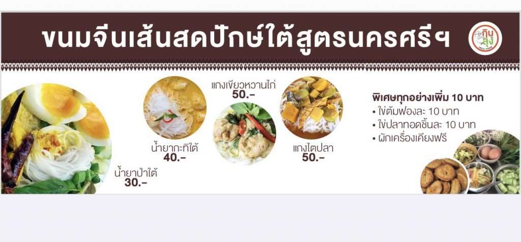 ทุกเมนู มีเอกลักษณ์ วัตถุดิบ เครื่องแกง หลักส่วนใหญ่ก็ส่งตรงมาจากภาคใต้ บวกกับเส้นขนมจีนสด ที่ทำกันแบบสดใหม่ ๆ ทุกวัน ยิ่งได้ลิ้มรสไข่ปลาทอดของดังจากทะเลน้อยผลิตสดๆวันต่อวันส่งตรงมาที่นี่ อีกอย่างที่สาวกนักกินขนมจีนปักษ์สิ่งที่ขาดไม่ได้คือ ไข่ต้ม ผ่ามาแดง เยิ้มๆ แล้ว ยังมีไก่ทอด รวมถึงเครื่องเคียงผักผักสดครบตามแบบฉบับปักษ์ใต้แท้ ๆ ในราคาอิ่มละไม่เกิน 50 บาท