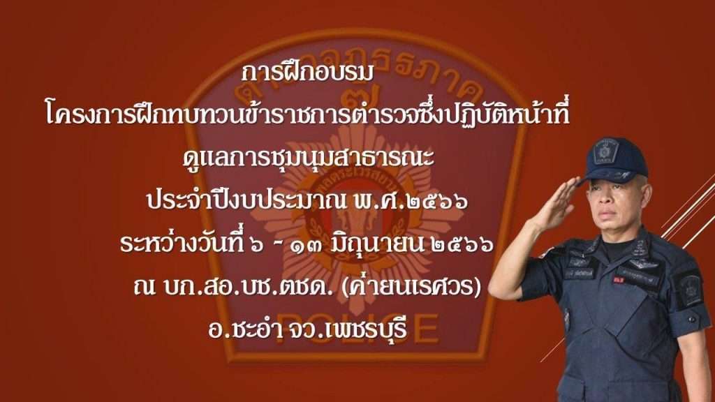 วันนี้(วันอังคารที่ 6 มิ.ย. 66) เวลา 11.00น.ที่ บก.สอ.บช.ตชด.(ค่ายนเรศวร) อ.ชะอำ จ.เพชรบุรี พล.ต.ท.ธนายุตม์ วุฒิจรัสธำรงค์ ผบช.ภ.7เปิดเผยว่า วันนี้ ได้ไปเป็นประธาน”พิธีเปิดโครงการฝึกทบทวนข้าราชการตำรวจในสังกัดภ.7ซึ่งปฏิบัติหน้าที่ดูแลการชุมนุมสาธารณะ ประจำปีงบประมาณ 2566″