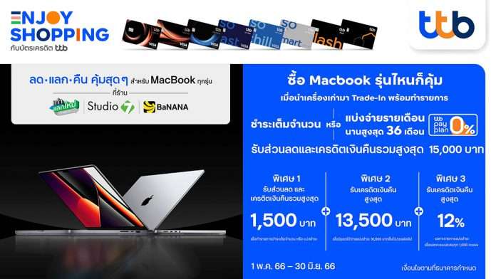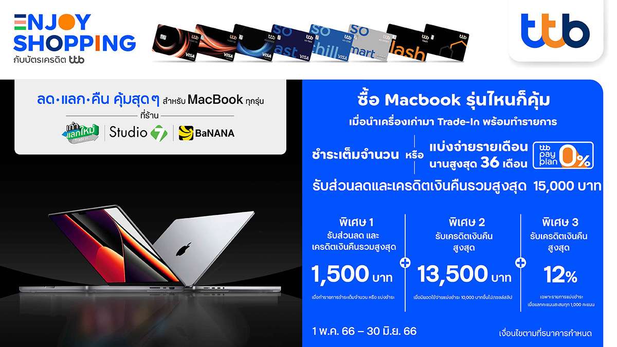 ทีเอ็มบีธนชาต หรือ ทีทีบี มอบสิทธิพิเศษสำหรับผู้ถือบัตรเครดิตและบัตรกดเงินสด ttb จับมือ BaNANA และ Studio7 ทั้งลด แลก คืน คุ้มสุด ๆ กับ Macbook ทุกรุ่น ทั้งการชำระเต็มจำนวนและแบ่งชำระ ณ BaNANA และ Studio7 ทุกสาขา ระหว่างวันที่ 1 พฤษภาคม 2566–30 มิถุนายน 2566