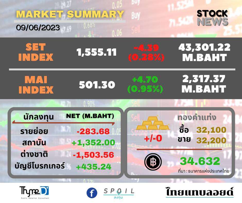 SET ปิดวันนี้ที่ 1,555.11 จุด ลดลง 4.39 จุด (-0.28%) มูลค่าการซื้อขาย 43,293.70 ล้านบาท
