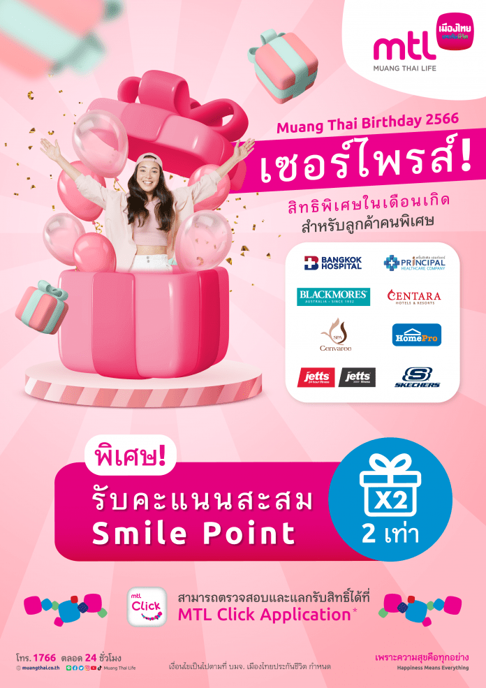 “ทุกประสบการณ์แห่งการดูแล การสร้างสรรค์กิจกรรม สิทธิประโยชน์และแคมเปญต่างๆ ที่ตอบรับกับ Lifestyle ของลูกค้าและสมาชิกเมืองไทยสไมล์คลับ ในการสร้างความสุขและรอยยิ้ม ที่ทุกท่านสามารถเข้าร่วมได้ตลอดทั้งปี 2566 โดยการรับสิทธิพิเศษฟรี ส่วนลดร้านค้า และการแลกคะแนนสะสม Smile Point เพื่อให้ลูกค้าสัมผัสได้ถึงความรู้สึกคุ้มค่ามากกว่าแค่คุ้มครอง ผ่านสิทธิประโยชน์ และกิจกรรมที่ตอบโจทย์ทุก Gen ตอบรับทุก Lifestyle ยกระดับการใช้ชีวิตของคุณสู่ Digital Lifestyle โดยลูกค้าเมืองไทยประกันชีวิต สามารถดูรายละเอียดสิทธิพิเศษในเดือนเกิดได้ที่ www.muangthai.co.th และกดรับสิทธิพิเศษได้ในวันเกิดของลูกค้า ผ่านแอปพลิเคชัน MTL Click ซึ่งมีระยะเวลาการรับสิทธิ์ 90 วันนับจากวันเกิด
